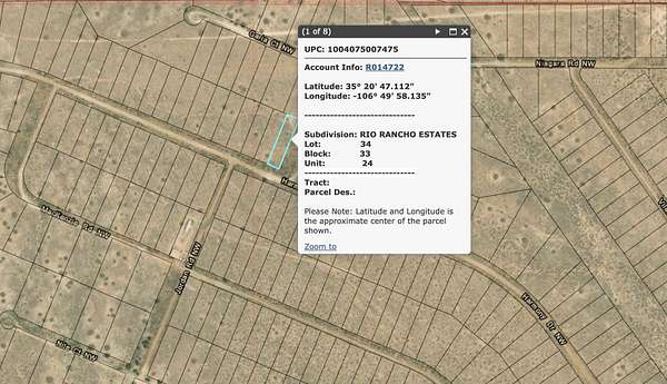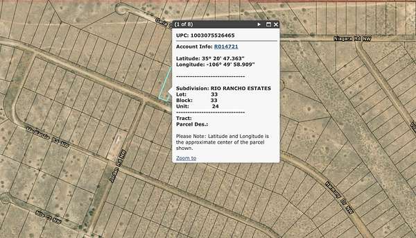 Est $140/moFour adjacent 1/2-acre lots (2 acres total) in Rio Rancho, including a desirable corner lot. Located in the quiet high desert, this property offers sweeping views, endless blue skies, and peaceful surroundings. No HOA and countless possibilities. Link to Google Maps location: