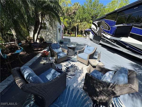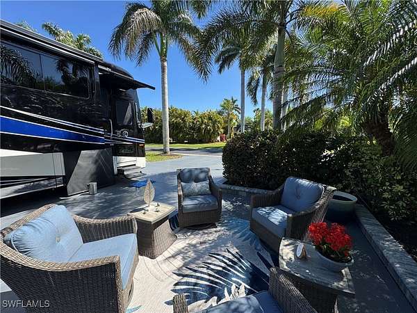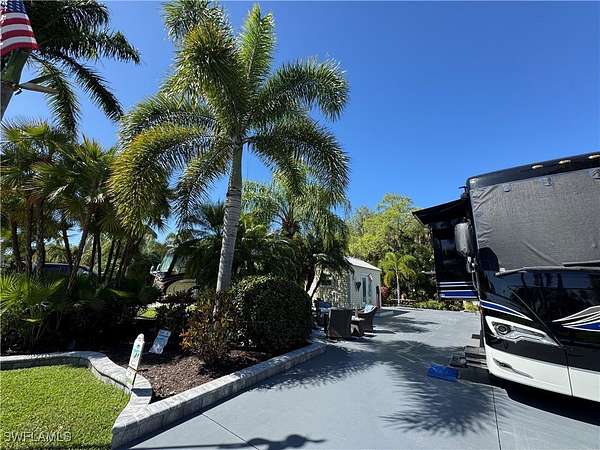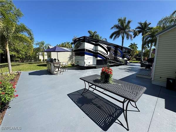 Lot 290: A Serene Retreat of Pride and Tranquility. Discover the peaceful charm, where pride of ownership radiates throughout this serene oasis. This inviting back-in lot with opens to a tranquil outdoor lanai, complete with an outdoor grilling station, cozy seating for two, and pop-up umbrella adds the perfect touch of shade. BONUS this property has had the extended 15 foot concrete also to the back of the lanai. Let the melodies from the built-in speakers envelop you, transforming every outdoor moment into a serene and delightful retreat. The front patio area is a haven for relaxation, ideal for savoring your morning coffee or basking under a canopy of evening stars. Step into the impeccably maintained coach house, where simplicity meets functionality. It offers space for a charming coffee bar with storage cabinets above and below. The small kitchenette includes a refrigerator, while a storage closet ensures all your essentials are neatly tucked away. The bathroom has a convenient shower and a space for the full-sized stacked washer and dryer, ensuring both comfort and practicality. The surrounding gardens have been lovingly refreshed with new raised pavers, adding a polished touch to the property's lush greenery. A backyard garden area, planted with butterfly-attracting flora, offers a tranquil setting to witness the magic of nature as butterflies transform from cocoons to graceful flight. This lot overlooks an expansive green common area, a serene stretch of manicured grass, perfect for leisurely strolls with your furry companions. Experience the harmonious luxury of RiverBend Motorcoach Resort, where every detail has been designed for comfort, community, and natural beauty. RiverBend Motorcoach Resort isn't just a community, it's a lifestyle defined by tropical elegance and unforgettable experiences. Residents here form close friendships while enjoying an array of top-notch amenities, including a resort-style pool, pickleball and bocce courts, shuffleboard, a putting green, and a private boat ramp with direct access to the scenic Caloosahatchee River. Dive into creativity at the Creations Clubhouse or embrace the excitement of the R/C racetrack and Boat Club. This pet- and golf cart-friendly oasis perfectly blends tranquility with vibrancy, where active owners thrive amidst breathtaking mature landscapes and expansive common areas with stunning river views. Don't miss the chance to own a slice of paradise in one of the most sought-after Class A motorcoach resorts, where old Florida charm meets modern vacation luxury. Please ask what Items convey with purchase.