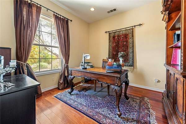 Truly One-of-a-Kind Single-Story Estate in Presidio Estates on 6+ Acres! Welcome to 7940 Choi Dr, a stunning custom-designed single-story home that beautifully combines luxury, comfort, and privacy on a combination of flat and rolling natural landscape. With over 100 citrus trees, including avocado, pomegranate and a variety of ornamental fruit trees, this property offers a peaceful, private retreat with the charm of a mini orchard. This exceptional residence features over $200,000 in thoughtful upgrades, including an open-air atrium with a striking custom rock fireplace, ideal for serene relaxation or hosting under the stars. Step inside to find elegant custom cabinetry, high-end wood flooring, and designer interior paint that radiates warmth and sophistication. The French Country-style kitchen boasts a generous granite island, Viking appliances, and sub-zero refrigerator that stays with the property. This kitchen is perfect for gatherings, and flows effortlessly into the expansive family room complete with a custom wall-to-wall built-in unit--designed for both display and storage. Tucked privately off the entry is a stylish home office, offering a quiet and focused space. The primary suite is thoughtfully placed on one side of the home, while secondary bedrooms are located on the opposite wing--one with it's own bathroom for ultimate privacy and convenience, and two Jack-n-Jill bedrooms with a full bathroom in between. Enjoy low-maintenance desert landscaping, while the oversized 5-car garage provides additional space for storage, hobbies, or a workshop. Charge your Tesla or EV right from the garage. Plenty of solar panels mean this electric bill comes in low every month! Did someone say view? How about privacy? This home has it all. This is a rare gem where luxury meets tranquility--a truly unique opportunity you don't want to miss! Call Barbara for your private showing: (951) 675-3949.