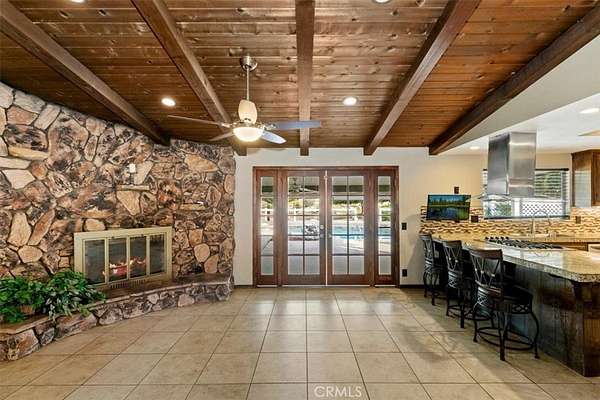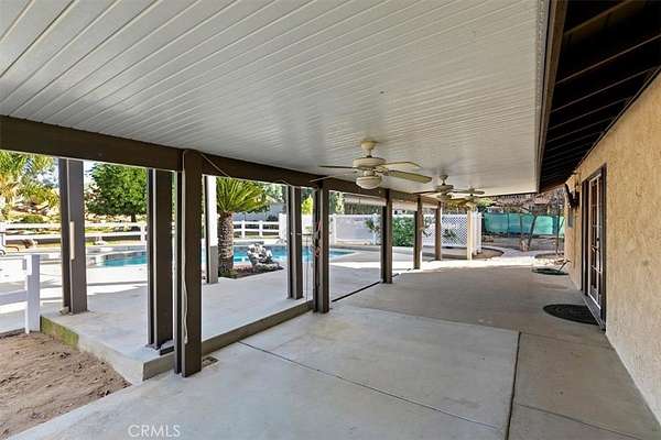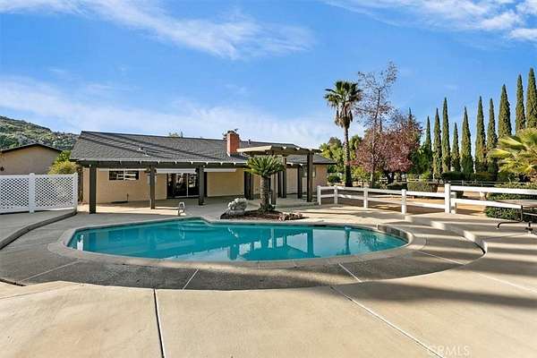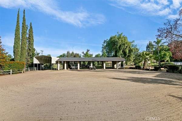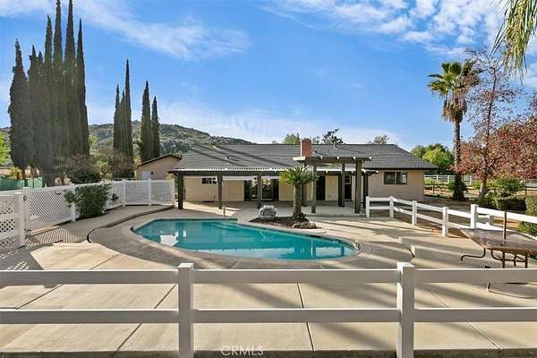 Beautifully maintained ranch-style home featuring a charming covered front carriage porch, privately gated and situated on 1.50 acres with a circular driveway. The property is fully fenced with convenient pull-through double gates providing full access to the backyard. Step inside to a tiled entry and formal living room accented with plantation shutters. The inviting family room showcases stunning wood-beamed ceilings and a dramatic full rock wood-burning fireplace creating warmth and character throughout. Real wood doors and wood casings highlight the home's quality craftsmanship. The kitchen is open to the family room and offers a breakfast bar, granite countertops, newer stainless steel appliances, double ovens, microwave, and large windows overlooking the backyard. The home features 3 spacious bedrooms and 2 bathrooms, including a hall bath with tub/shower combo. The primary suite includes a private bathroom with dual sinks, vanity, and direct access to the back patio. The exterior has been freshly painted and the backyard is perfect for entertaining with a covered patio featuring an Alumawood cover and a sparkling swimming pool. Equestrian amenities include a 4-stall block barn with tack room and hay storage, along with a large RV cover. Plenty of room for an arena, shop, or ADU. This exceptional property truly reflects pride of ownership.