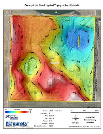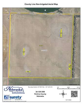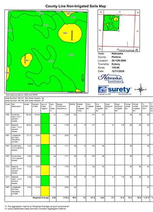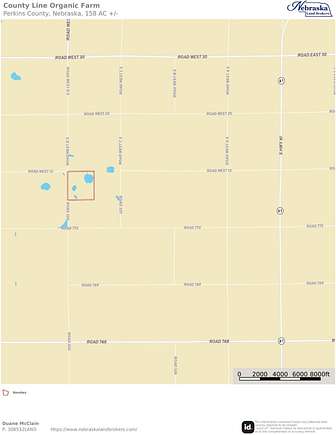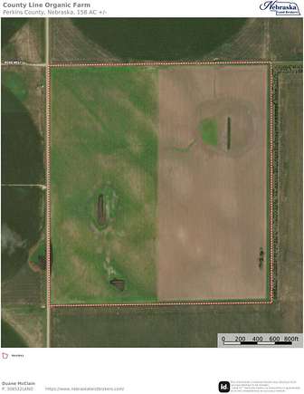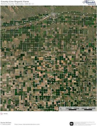 COUNTY LINE ORGANIC FARM NORTHERN PERKINS COUNTY, NEBRASKA FARM Highlights include: 158.89 Total taxed acres Certified organic since 2014 155.37+/- non-irrigated cropland acres County Road 324 along western side Buyer to receive landlord's share of '25 wheat LEGAL DESCRIPTION: NW1/4 Section 20 - Township 12 North - Range 39 West of the 6th P.M., Perkins County, Nebraska; FSA BASE INFORMATION: Available upon request. REAL ESTATE TAXES: 2024 taxes payable in 2025 are $1,283.46 CROPLAND SOILS: 91.3% Class II Kuma and Satanta loams with 0 - 3% slopes and 8.7% Class III Lodgepole and Satanta loams with 3-6 slopes or frequently ponded. Organic Farm Summary This very nice certified organic farm is located in northern Perkins County on County Road 324 (Road West D South from Keith County) and the County Line. This is approximately 4 miles west of Highway 61. The farm does have a two track trail road along the north boundary. The farm has been operated as a certified organic farm since 2014. There is a grass buffer on the southern and eastern side of the farm. 100% of the cropland is currently as growing wheat and the Buyer shall receive the landlord's share of the '25 wheat crop. Buyer will also pay Seller for inputs into the growing wheat crop including seed and crop insurance.