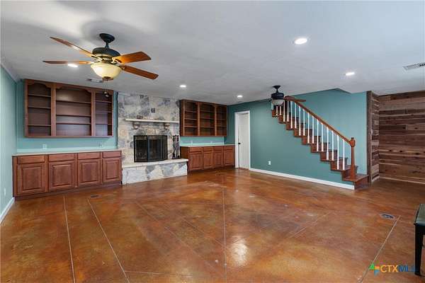 - Attic, Beamed Ceilings, Bookcases, Breakfast Area, Cedar Closets, Ceiling Fans, Crown Molding, Kitchen Dining Combo, Kitchen Family Room Combo, Kitchen Island, Main Level Primary, Multiple Closets, Multiple Living Areas, Primary Downstairs, Recessed Lighting, Separate Shower, Shower Only, Tub Shower, Vanity, Window Treatments