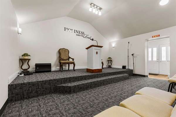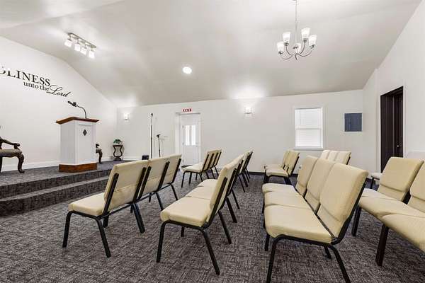 This unique property is zoned R-1 and was most recently used as a church, though it was originally a residence. Conversion back to a single-family home is possible with required city permits. Beautifully remodeled throughout, the building features a spacious gathering room with a stage, vaulted ceiling, and brand-new carpet, comfortably seating approximately 30 people. All chairs are included. Additional features include a galley-style kitchen equipped with a refrigerator, gas stove, and microwave, as well as two office rooms ideal for administrative use. The property offers two half bathrooms and is equipped with a brand-new furnace and water heater. Situated on a large corner lot spanning two parcels, the property also includes central air conditioning, 100-amp electrical service, a Nest thermostat, new front doors, and a Ring security system--all of which will stay with the property. Freshly painted throughout. A truly distinctive opportunity with flexibility for future use.