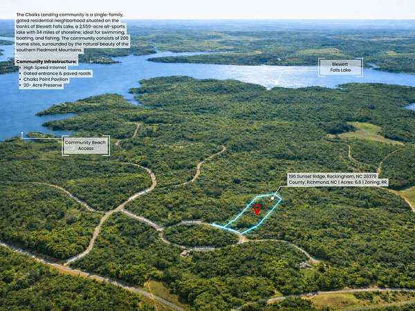 6.6± acres of scenic vacant land in gated Chalk's Landing on Blewett Falls Lake, a 2,550-acre all-sports lake offering boating, fishing, and year-round recreation. The property features well-drained Pacolet sandy loam soils, rolling Piedmont topography, and a peaceful natural creek that adds privacy and charm. Chalk's Landing is a well-maintained, single-family lake community designed to preserve long-term value and enjoyment. Owners benefit from private lake access, paved roads, gated entry, high-speed internet, underground utilities, a lakeside pavilion, and a 20-acre nature preserve. Homes are thoughtfully designed through an architectural review process, and rentals are permitted with a minimum 3-month lease. Septic and well installation required; buyer to verify suitability. Convenient to Pinehurst golf, Uwharrie National Forest, and Pee Dee Wildlife Refuge. Nearby Major Cities (Top 4) • Fayetteville, NC: ~56 miles | ~56 min • Charlotte, NC: ~57 miles | ~57 min • Greensboro, NC: ~74 miles | ~1 hr 15 min • Raleigh, NC: ~88 miles | ~1 hr 30 min Nearby Major Airports (Top 4) • Fayetteville Regional Airport (FAY): ~56 miles | ~56 min • Charlotte Douglas Intl (CLT): ~63 miles | ~1 hr 5 min • Piedmont Triad Intl (GSO): ~76 miles | ~1 hr 15 min • Raleigh-Durham Intl (RDU): ~86 miles | ~1 hr 30 min Nearby Major Attractions (Top 4) • Blewett Falls Lake: ~5 miles | ~5 min • Pinehurst Resort & Golf: ~26 miles | ~30 min • Uwharrie National Forest: ~30 miles | ~35 min • Badin Lake: ~31 miles | ~35 min Images are for marketing purposes only and may be enhanced. Lot lines and boundaries are approximate. Buyers to verify all information.