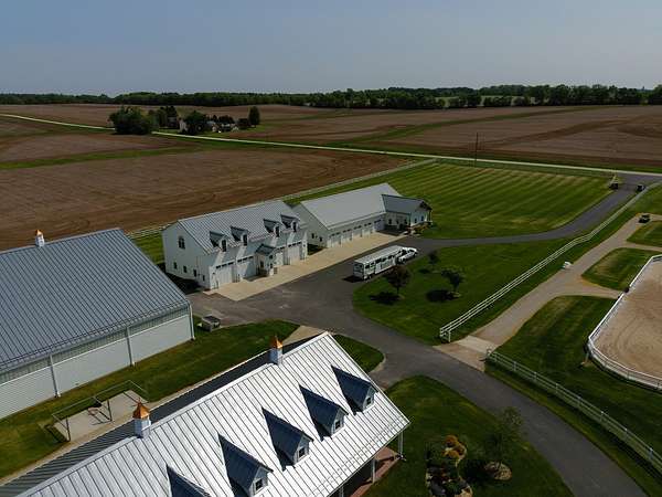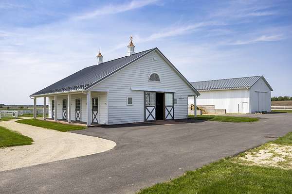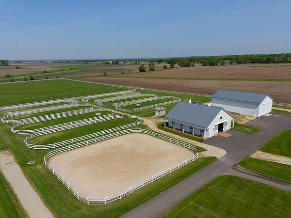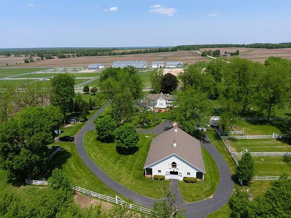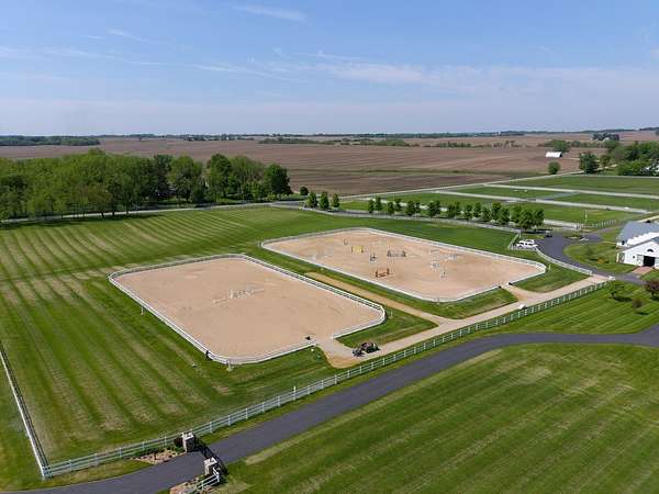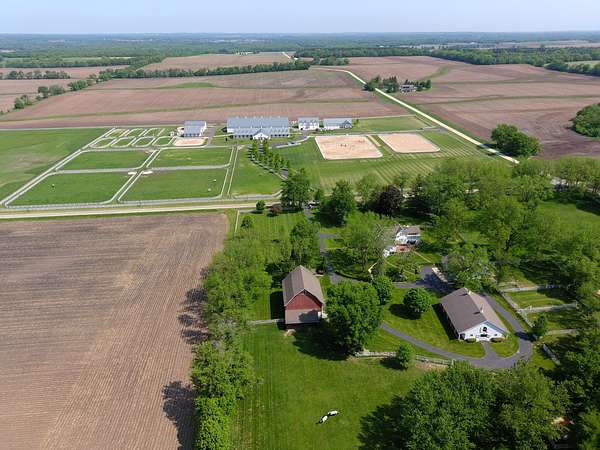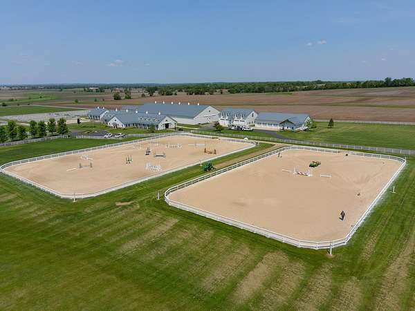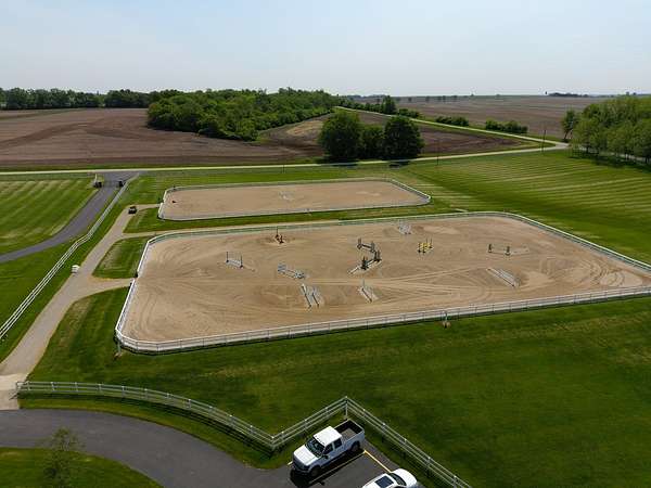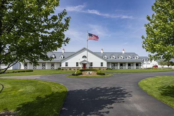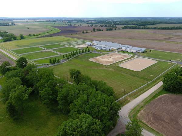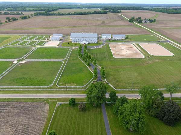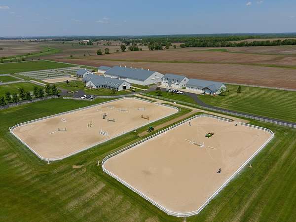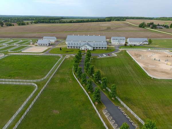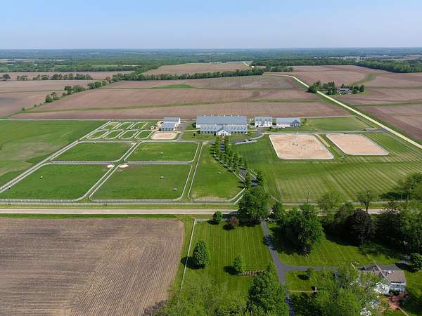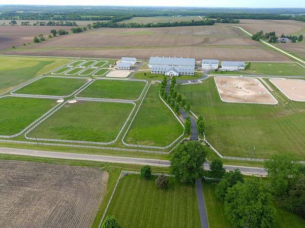 Top-of the line equestrian facility built with the horse in mind. Custom facility built in 2016 to house and train multiple grand prix level horses. Property designed to support and facilitate the needs of these top-level athletes. Main barn boasts 20 stalls with an attached 100' x 200' indoor arena. The barns and indoor arena feature architecture designed to prevent dust in the barns as well as an intricate ventilation system with copper cupolas. Insulated Kalwall surrounding the top of the indoor arena for natural light. Two outdoor arenas measuring 150' x 250' and 120' x 220' with drain tiles and an additional grass derby field. Main barn is complete with a large common area, including a fireplace and a full bathroom. The main barn also includes a laundry room with a commercial washer/dryer. The feed room includes a fridge and metal-lined feed bins/closet. A large, beautifully laid out tack room with custom cabinetry, saddle racks, bridle hooks, and sink. Barns have custom steel doors with insulation as well as radiant heated floors and gas furnaces in the indoor arena. All stalls measure 12' x 12' and are equipped with Dutch doors, wall-mounted waterers aligned with the buckets, personalized fans as well as Big Ass Fans (brand name) along the aisle. Barn complete with custom-made trusses and antique lamps for a first-class look. Hot and cold indoor wash rack with radiant heated floors and an overhead infra-red heater. Four outdoor wash racks. Separate from the main barn, there is a heated vet/farrier barn with two stalls, grooming stalls, and a horse treadmill. Separate equipment barn with four tall garage doors, a bathroom, and two apartments above. Both apartments are 2 beds/ 2 baths. Additional building with a 5 car garage, office space and custom indoor shooting range. Separate hay barn. A beautiful historic home across the street for added privacy with an additional 9 stall barn and 75' x 110' outdoor arena. Owners are currently in the home and use smaller barn for the young horses. Home built in the 1860s and the large red barn, used for storage, is from the early 20th century. The property is a total of 46 acres. 31 total acres of new barn, including 10 acres of hay field, 8 acres across the street with the home and smaller barn, and 7 acres down the road with more hay fields. Property truly needs to be seen in person to appreciate the craftsmanship and beauty of the grounds. Be sure to view the attached video and information sheet. Equipment to be conveyed with sale, please view list in additional information. Located 15min from Ledges Sporting Horses and 1 hour from Lamplight Equestrian Center. Words do not do justice to the beauty and craftsmanship of this property.