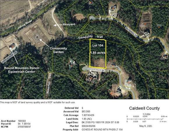1.85 acres with cleared flat build site; quiet culdesac ends just above Johns River and riverside amenities. Perc-ed for 4 BR but septic permit expired. Trail at back and trailhead across street come out at the river, vineyard, community garden, equestrian center and Waterfall Park. The homes across street and at end of culdesac are below street level, out of sight.The Coves is a 3,200 acre gated community in the Blue Ridge Mountains of North Carolina. There are miles of community exclusive trails to hike, bike, ride horses, or UTVs. There are 5 miles of frontage on the Johns River, with areas to put in and take out your kayak, wade and fish, picnic, or gather round a stone fire pit. The crown jewel of The Coves is the magnificent post and beam constructed clubhouse, Pisgah Lodge, located on one of the highest peaks. There, you'll enjoy a saline pool, fitness center, locker rooms, full kitchen, lending library, pool table, fire pits, wrap around porches, decks, and overlooks to take in 360o views of the Blue Ridge Mountains, South Mountains, and Brushy Mountains. The Coves is a Dark Sky Community, which minimizes light pollution and provides breathtaking star-gazing. Down by the river you can garden your private plot at the Community Garden or join your neighbors to care for and harvest the community cooperative vineyard. Pickle-ball and shuffleboard courts, putting green, and a picnic pavilion are located at another Coves's park, Wyatt's Landing. Additional amenities include 2 Equestrian Centers and a Dog Park. Join your neighbors for social events, excursions, hiking, travel, yoga. 500,000 acre Pisgah National Forest and the Wilson Creek Wild and Scenic River Area are across the road! 1.25 hour drive to Charlotte or Asheville, minutes to Lenoir, Blowing Rock, Morganton, and the Blue Ridge Parkway.