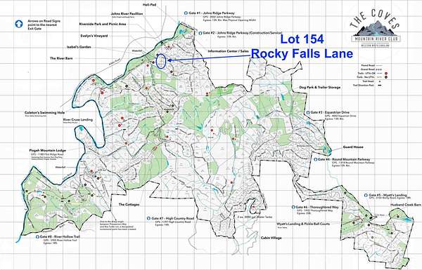 Enter The Coves at gates on Johns Ridge Pkwy. 3rd right on Rocky Falls Lane. Lot 154 is last lot on right at end of culdesac. Gate code required.