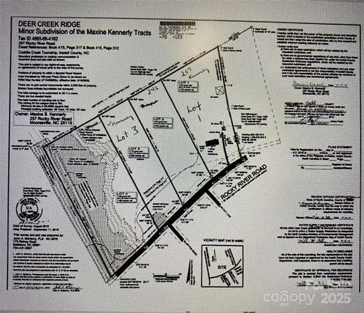 Please note that the owner has also listed 2under Residential property 257 Rocky River Rd which is 4.722 acres. Both properties are shown on attached map and are identified as Lot 3 for this property and Lot 1 for seller's additional listed property. Property located between these 2 properties is in the city and has city water. The zoning on the 62.89 acres located adjacent to the back of this property, which includes property also on Rocky River, has been amended to Conditional Residential General (C-RG) per Case CZ-2024-16. This adjacent property is also listed in the city. Buyers agent to verify all of this information with City Planning and Zoning Department for their buyer. Lot 3 has a shared driveway easement with lot 4. Drone pictures aren't intended to depict exact lot. Please refer to attached maps.