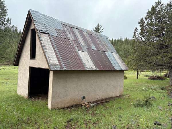 There are two unfinished structures on the edge of the meadow, a garage/storage building, and a small cabin. Both structures will need work to become fully usable buildings.