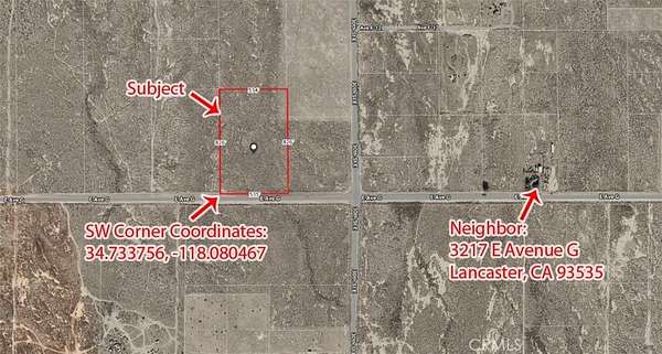 Neighbor's address: 3217 E Avenue G, Lancaster, CA 92535; SW corner: 34.733756, -118.080467