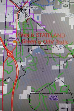 Calling all ATV/ORV enthusiasts! 5 wooded acres (Oak & Pine) abutting 350 acres of State Land in the rear, and over a THOUSAND acres of State Land directly across the road-along with miles of ORV trails, enough cannot be said of this location! You are within a mile of Exit 239 on I-75, the Fireman's Memorial and downtown Roscommon. Head WEST and you are on a beach at Higgins Lake within 5 minutes! Ride the trails all day and come home to a sprawling ranch with 3 bedrooms (possibly 4), 1 bath home and cuddle up to the fireplace with a cup of Joe! Hang out in the spacious yard or tinker in the Pole Barn on that project you've been wanting to work on for years! (Pole barn 30x40, dirt floors, ELECTRIC and large 9x10 slider door) Home needs a little TLC-estate and selling AS IS. Cash or CONVENTIONAL with 20% or more down. Property Layout: 165' at road, 1322 deep. Walking trails marked throughout property and follow property line. Spring will bring the lilacs, Summer the apple & crabapple trees which bring out the yellow, tiger swallowtail butterflies! George, the Pileated woodpecker as seen in the pictures, hangs out all year. (be sure to fill up his suet!)