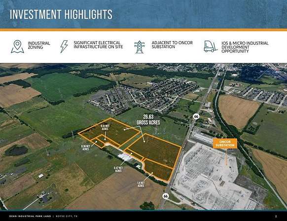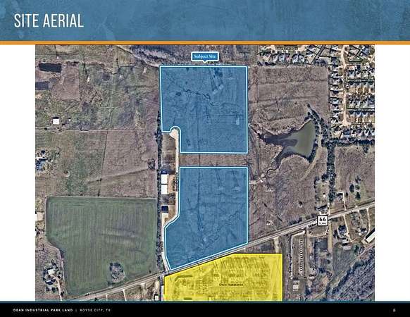 Est $9,002/moWe are pleased to present the opportunity for developers and investors with the opportunity to acquire Dean Industrial Park which is comprised of 26.63 gross acres on 10 separately platted lots yielding 2.55 acres net of easement areas. The site is located on Hwy 66 within The Royse City city limits and has access to water, sewer, and electricity.