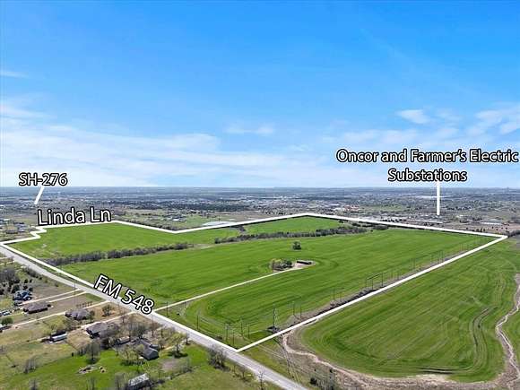 Platinum Land Group is proud to offer this 139+- acre property located in the rapidly growing area of Rockwall County and within the Royse City ISD. The site offers excellent visibility with frontage on FM 548 and Linda Lane, along with high traffic exposure--75,000 VPD on I-30 and 15,000 VPD on Hwy 276. Ideal for industrial, commercial, agricultural, or rural residential development, the land is situated outside the city limits of Fate and within the Fate ETJ. The property is AG exempt and benefits from utility access, with Oncor and Farmer's Electric substations located along the west boundary. With easy access to I-30, Hwy 276, and just 40 minutes from downtown Dallas, this is a prime location for future development. Survey available.