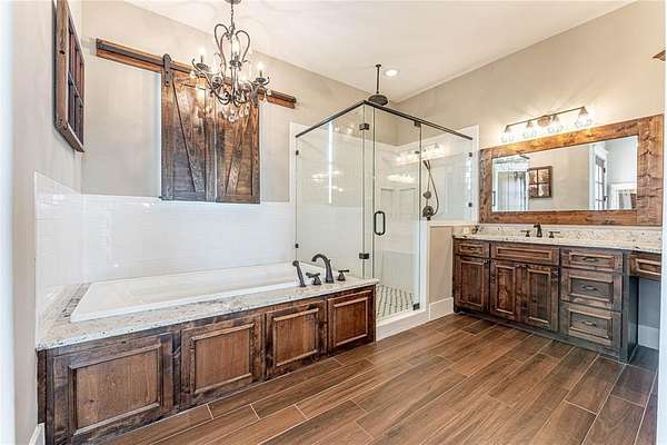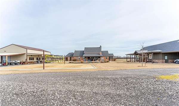 Prepare to be captivated by this stunning 2,668 sf custom-built home, perfectly complemented by a 1,255 sf guest house, a 1,200 sf shop and barn, all set on a peaceful 10-acre estate. Behind the gated entry, the main home welcomes you with rich hand-scraped wood floors and exceptional attention to detail. The chef-inspired kitchen boasts custom designer cabinetry, a farmhouse sink, oversized island with prep sink, breakfast bar, and gleaming granite countertops, a true culinary dream. The open concept living room impresses with soaring ceilings, a dramatic two-story stone fireplace, and an abundance of natural light. A separate dining room provides an elegant space for entertaining. Retreat to the luxurious primary suite, featuring a spa-like ensuite with dual vanities, a garden tub, separate shower, and a generous walk-in closet. Three additional spacious bedrooms, including two downstairs plus an upstairs living area and media room offer plenty of space for family or guests. The fully equipped guest house mirrors the quality of the main home, with a modern kitchen, cozy living room, and a private master suite. Ideal for visitors or multigenerational living. Step outside to your own private resort: an in-ground pool, expansive patio, sand volleyball court, outdoor wood-burning fireplace, built-in grill and sink, perfect for hosting unforgettable gatherings. Whether you're looking for space, serenity, or style. This one-of-a-kind property truly has it all. Love these homes, but looking for more land? See separate listing for custom homes, shop, barn and 54-acres. MLS 21155583