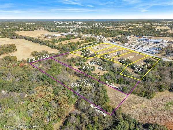 PRIME 2.47+- ACRE COMMERCIAL LOT IN EMORY, TEXAS! Exceptional commercial opportunity, for almost 2.5 acres down a tree-lined County Road, that adjoins Commercial Corner Lot #1 and-or Lot # 2 with great visibilty on State Highway 19 - located inside the expanding Emory city limits. This 2.47+- acre tract (Commercial LOT#6) offers more than 380' of frontage on RS County Road 1150, providing outstanding exposure and easy access for a wide range of commercial uses. Recently zoned Commercial, but could easliy be zoned residential as well....with city & county utilities & services nearby, the property sits just over one mile from downtown Emory, just off SH -19. The location offers immediate development potential or long-term investment value in a market known for strong community pride and a welcoming small-town feel. Emory continues to grow, supported by its position between Lake Fork & Lake Tawakoni and its proximity to the DFW Metroplex and Tyler--driving demand in tourism, retail, and local services. Addt'l. ADJOINING Commercial Lots &-or Residential Lots are available. Seller is open to flexible subdivision or combinations of lots to accommodate buyer requirements, making this site well suitable for retail, local services, hospitality, or mixed-use development. The land has clearings, beautiful woods & a slight roll, with sandy soil & this this lot has no flood plan. This exceptional location offers easy access from SH 19. This lot, has an old pole barn building & shed (assigned no value) from the days of the Emory Archer Club, & overlooks the neighboring Residential Lot # 7's serene pond. Seller financing is available & with various lot options offered from 2-6.9 acres (which can be combined) - options to suit your business need are endless. If you are considering one of the adjoining Resdential Lots (Lot # 7 or 7 & 8 combined) this Lot could provide additional acreage, if desired. All lots contracted will be platted prior to Closing. More info needed? Contact Agent