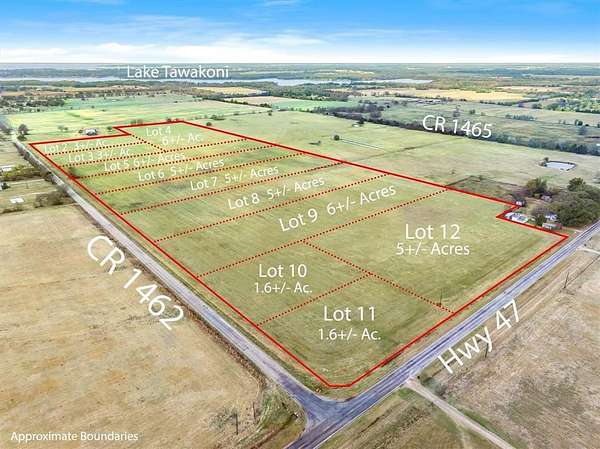 Coming from East Tawakoni on 276, take a right on FM 47 at the stop sign. Approximately 1 mile down the road, take a right on CR 1462. You'll see the FOR SALE signs out there!