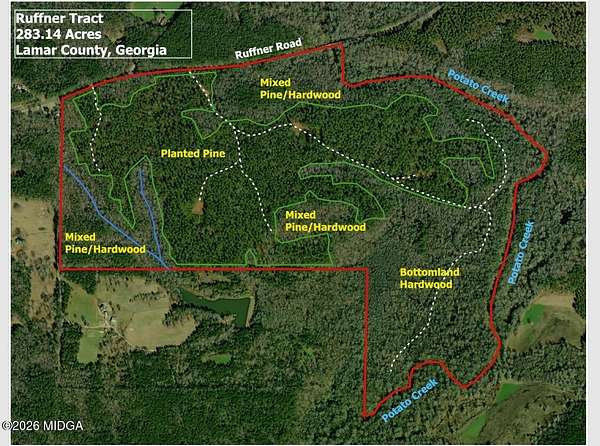 Est $12,547/mo283.14 Acres Located in Western Lamar County. This Remarkable Tract Features a Stunning Blend of Mature Planted Pine Stands, Majestic Upland, and Bottomland Hardwoods. Over 1.4 Miles of Frontage on Potato Creek and Over 1/2 Mile of Frontage on Ruffner Road. Great Interior Road System. Established Food Plots, Plentiful Game Including Deer, Turkey, and Ducks. Great Location just Minutes from Barnesville, Thomaston, and Griffin. This Truly is an Amazing Tract.
