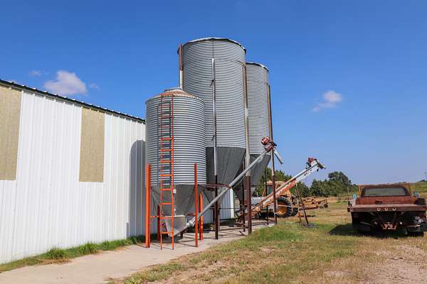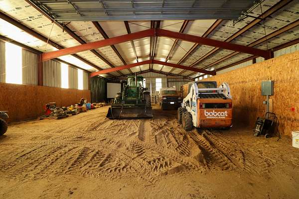 The working facilities are equally robust. A 50-by-130-foot metal building serves multiple functions including equipment and supply storage, a workshop, a tack room, and a bunkhouse with a bathroom and small kitchenette. Inside, the building features an alleyway for working cattle, dedicated calf areas, a hay loft, and a warm room. Additional exterior facilities include a feed mixing area, calving and backgrounding zones, and dedicated areas for winter feeding. The property also includes sorting pens, a loading/unloading chute, and ample space for trucks and trailers.