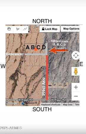 From I-10 go south on Jackrabbit Trl, go left on Elliot Rd, go south on Rainbow Valley Rd, go right on Riggs Rd. go right on 191st ave, lots are about 1/4 mile north. Lots on left hand side.