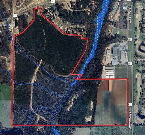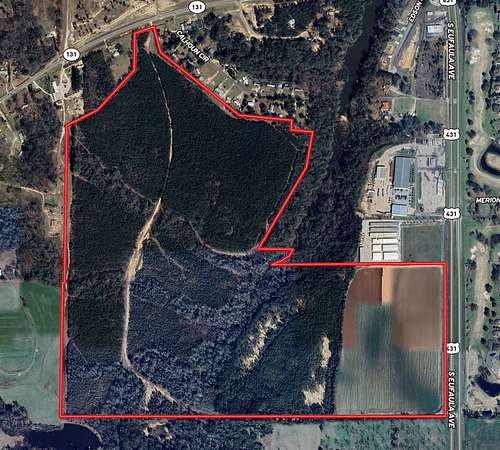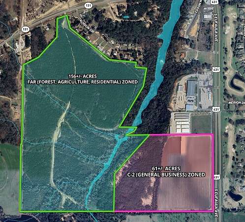 Est $11,798/mo218 acres with road frontage on Hwy 431 & 131 in Eufaula. Zoned C-2 & FAR, offering commercial, residential & mixed-use potential. Features 1,515' frontage on Hwy 431, 200' on Hwy 131, service road, graded interior road w/ bridge, 34 ac row crop, and a Lake Eufaula water finger. Across from the Country Club of AL, a prime growth corridor.
