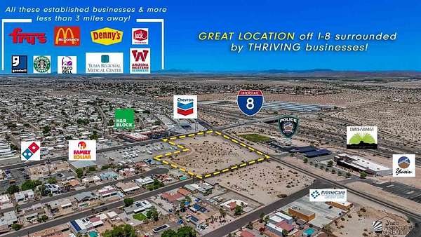 Est $34,266/moThis commercial parcel, located at the prime corner of I -8 and Foothills Blvd, serves as the gateway to Yuma. Spanning over 5 acres, it offers excellent visibility and is situated in a rapidly developing area. Directly across from the new Chevron station, this site is ideal for a variety of commercial uses.