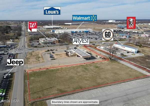 Prime 1.45+/- acre commercial retail site located at a major commercial intersection in Carthage, MO. The property surrounds Arvest Bank and offers excellent visibility and traffic exposure in a strong retail corridor. Nearby anchors include Walmart, Walgreens, Lowe's, Go Car Wash, Fair Acres Family YMCA, Carthage High School, Carthage Chrysler Dodge Jeep, and a Tractor Supply currently under construction. All utilities on site including water, electric, and sewer. Access from Grand Ave with proposed access from Fir Road, allowing flexible site design. Ideal for retail, restaurant, or service-oriented development in a high-growth area.