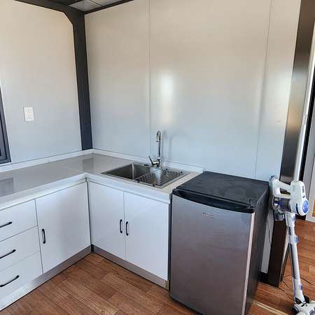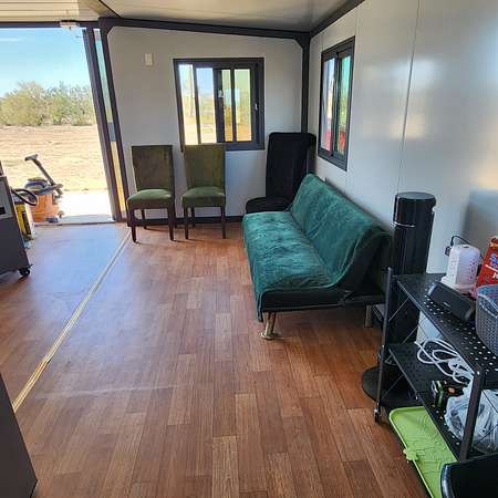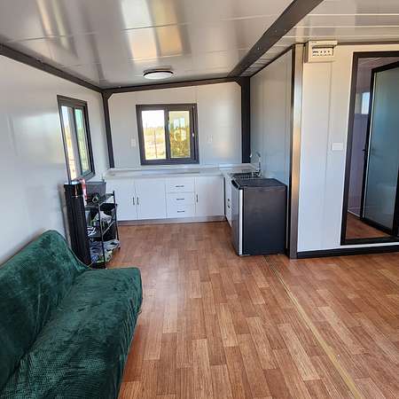 MOVE IN READY 400 sq ft off grid home is fully functional by solar and hauled water. 2bd/1ba bedrooms can be easily converted to one large bedroom.