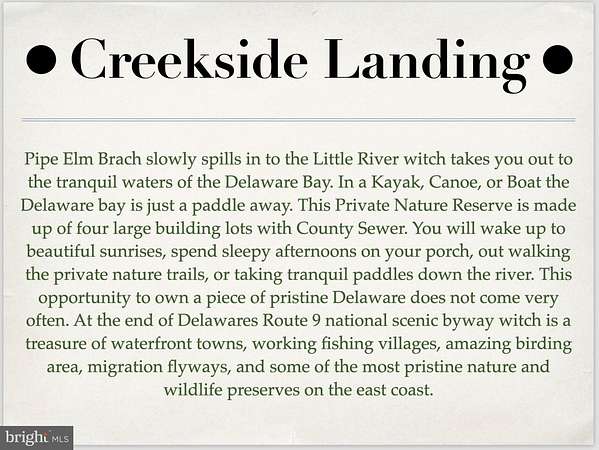 Approximately 13 acres of natural beauty, just a couple of minutes from the Delaware bay. Walking distance to the new 2.5 million dollar public boating and fishing marina. This amazing property consists of four building lots that were created before 1960 which allows for a realignment if so desired. County sewer available, City of dover electric, private well water. The property fronts S. little creek rd. for about 1,480 feet with two gated entrances and a 700 foot paved rd that runs through the property. Wetland delineation completed and is ready for all your dreams. This property can be an amazing private residential nature preserve, campground, Estate type private residence, four home private luxury gated community and on and on endless dreams and possibility's. Come and create your ultimate private luxury resort or so many other dreams.