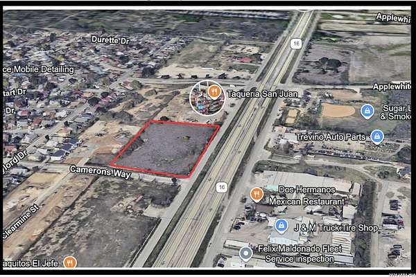 Est $9,066/mo3.116 acres of C-2 zoned land located on a hard corner with frontage along S State Hwy 16 in San Antonio. Property is situated near the JCB 720,000 sq ft industrial facility under construction and is adjacent to multiple new townhome developments. Close to Toyota plant. Surrounded by ongoing residential and commercial growth. Utilities available nearby; buyer to independently verify zoning, utilities, access, and permitted uses. Property sold AS IS.