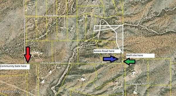 I-10 & Colossal Cave- N to Frontage Rd. R on Frontage 10MI- L on Red Hill Ranch- 1.5MI- R on Twinstar- L on Orions Gate to top of hill- L on Taurus. N on Paved Road (easement)takes you to the bottom tip of parcel.