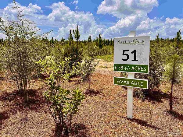 Discover the beauty of NatureWalk at Pond Creek, one of the most prestigious land communities in Northwest Florida. NatureWalk is nestled amidst pine tree forests, lush greenery, scattered oaks, and natural flowing creeks. The idealistic landscape is almost "untouched," providing privacy, peace, and serenity for each lot. Lot 51 is a spacious and private lot situated at the end of South Timber Lane. This 6.58-acre parcel features a nearly 160-foot cleared, curved driveway connecting the paved South Timber Lane with the 1-acre clearing designated for the future homesite. Lot 51 features a diverse array of trees, ranging from small cedar trees and pine trees to tall hardwoods at the back of the property. ADDITIONAL COMMUNITY INFORMATION: NatureWalk at Pond Creek community was launched in 2023, and since then, this exclusive community has become a place that attracts buyers from all across the United States. The Owner's vision for this community is simple: Quality Family Living Centered Around Nature. Curved and paved roads, a distinctive community layout thoughtfully combined with Northwest Florida's natural beauty, high-end landscape features, common areas set in a scenic natural environment, and high-speed internet are all reasons for that. This unique community is situated on 653 acres of land, comprising 100 lots in total, and features homesites ranging from 2 to 15+ acres, including premium creek-front parcels. As of July 2025, close to 50 out of 100 parcels have been sold. LOCATION: Another aspect that makes this community very special is its location. NatureWalk at Pond Creek is conveniently located within a short drive of Publix, Big-Box stores, restaurants, and hospitals. Our community is centrally located for outdoor enthusiasts: from Blackwater River freshwater fishing and boating to our Gulf Coast, featuring the emerald blue waters of the Gulf of Mexico and beautiful beaches.