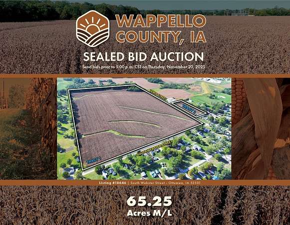 Presenting two tracts of land located within the city limits of Ottumwa, Iowa, to be sold at public auction via Sealed Bid Auction. Bids due by Thursday, November 20th, 2025. These tracts offer a diverse range of opportunities. Zoned R1-60 (Single-Family Low-Density District), they carry strong potential for future residential development. In addition, the properties are located adjacent to a substation with transmission lines running parallel, creating possible opportunities for future solar energy use. Together, the tracts feature 57.6 cropland acres carrying a CSR2 rating of 62, making them well-suited for continued use as productive row crop farmland. Don't miss your chance to acquire a diversified property on the edge of Ottumwa, Iowa, with both agricultural and long-term development potential. This auction is being conducted as a Sealed Bid Auction: Sealed Bids, in written or electronic format, for the Property will be due no later than 5:00 P.M. CST, on Thursday, November 20th, 2025. Visit our website for more informaiton regarding this 2 Tract Auction.