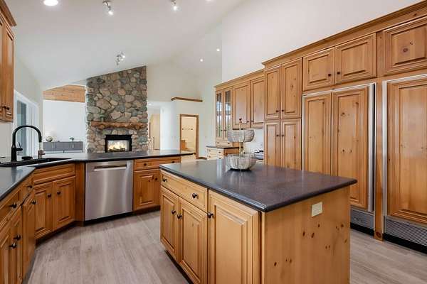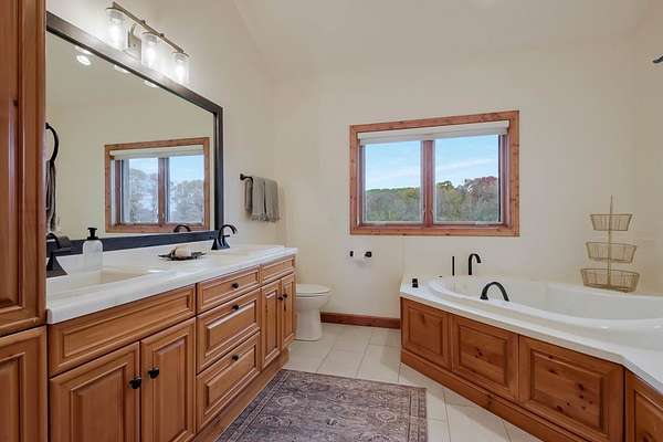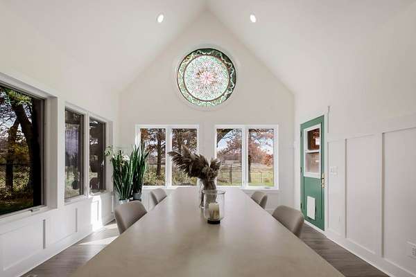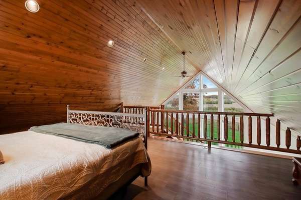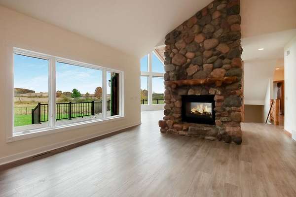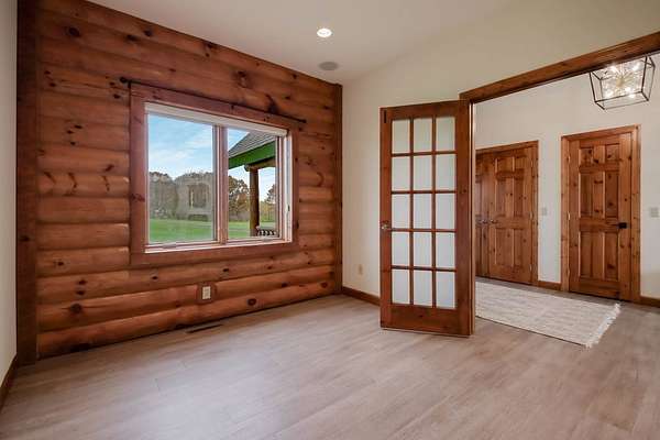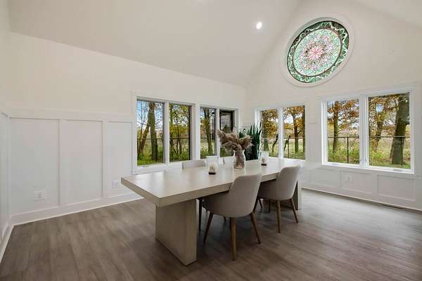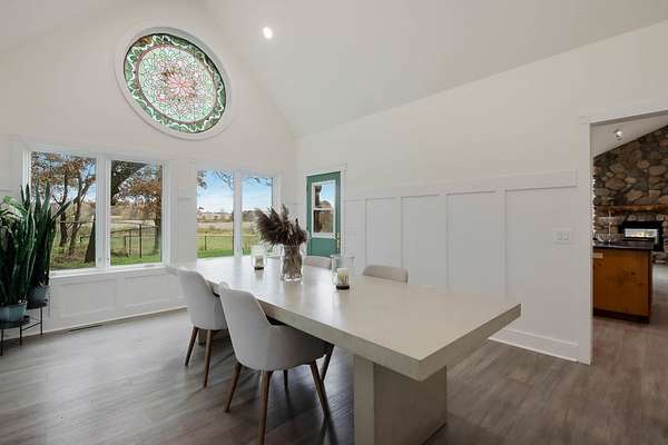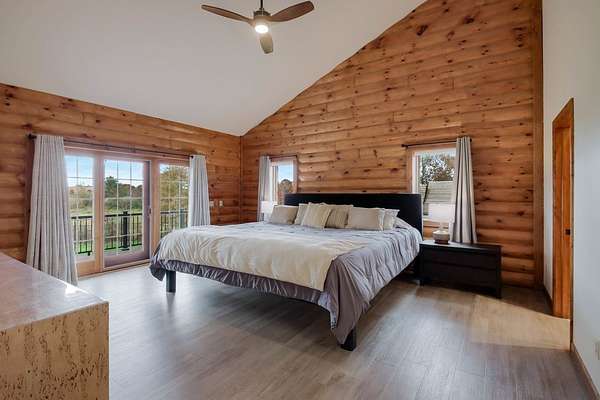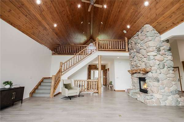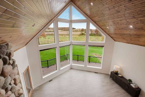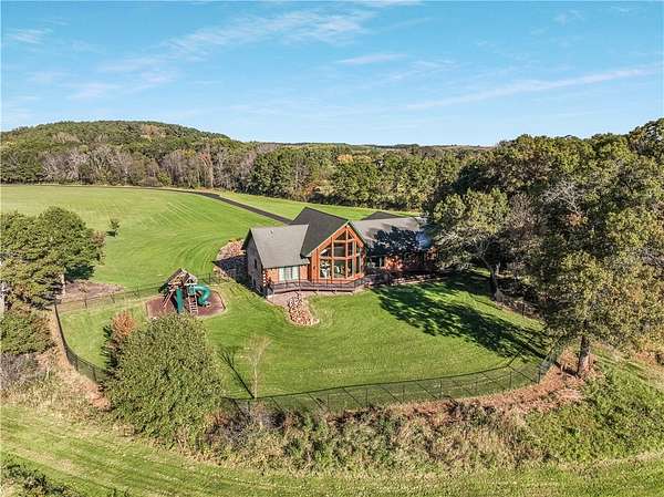 This property has it all! A lovely custom home situated on 40 gorgeous acres with/ Beaver Creek trickling through the backyard! Just minutes south of EC and Eau Claire schools- Memorial/South/Robbins! You'll enter the front door to a million-dollar view!! Features include a huge master suite with WIC, vaulted ceilings, massive field rock fireplace, geothermal heat and a/c, heated oversized 3 car garage with basement entrance, chef's kitchen with Sub Zero freezer and refrigerator, Wolf cooktop, huge laundry/mudroom, grand dining rm w/ stained glass window from St. Raymond's - that could be a home office w/ separate entrance! The floor-to-ceiling windows offer tons of natural light, adding to this home's grand design! The 40-acre spread includes... a new fruit tree orchard, honey bee garden, a new 2025 custom chicken coop w/ 10x10 hen house, a flower/veg garden, open fields, crops, and a trail over the Creek! New sprinkler system surrounding the home. Exterior Log was professionally conditioned and sealed in 2023. The home is NOT in a floodplain; however, some areas of the acreage are. See CSM attached. Rainbow playset is included.