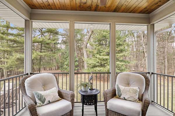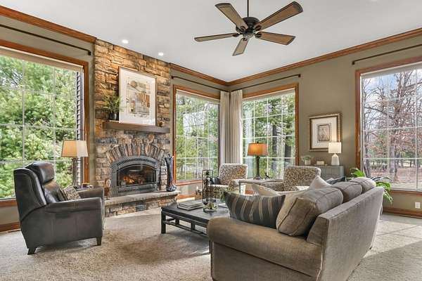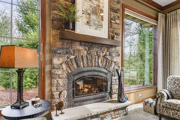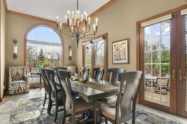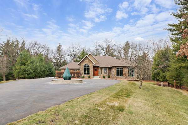 If you’ve been waiting for the perfect blend of privacy, luxury, & location-this is the one. Just 2 mi. from Lake Delton, this stunning 4-bedroom executive ranch is nestled on 3.84 wooded acres in a private community, offering a true retreat setting w/the convenience of nearby attractions. Designed for comfortable main-floor living, home features 12ft ceilings, crown molding, & sunken LR anchored by a striking stone fireplace & walls of windows showcasing peaceful wooded views. Chef’s kitchen is equipped w/high-end SubZero, Cove, & Viking appliances & flows seamlessly into the formal dining area—ideal for both everyday living & entertaining. Fresh paint & thoughtful updates make this home truly move-in ready. Enjoy the screened porch overlooking a beautifully landscaped yard, patio, & hot tub area perfect for relaxing or hosting guests. Storage & functionality shine with a 3-car attached garage featuring durable vinyl flooring & built-in cabinetry, plus separate 2-car carriage house.