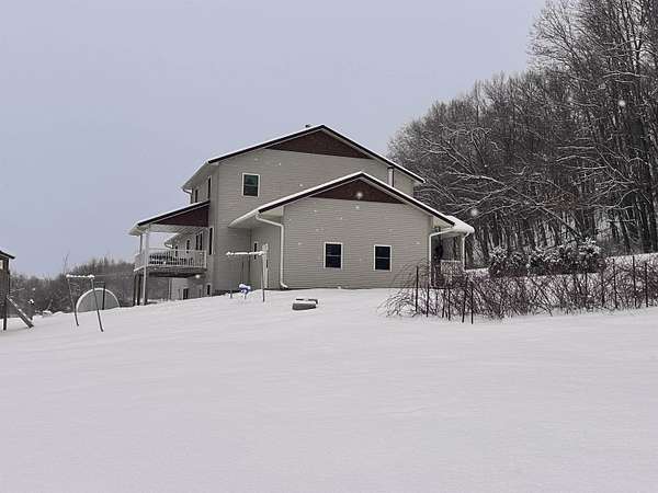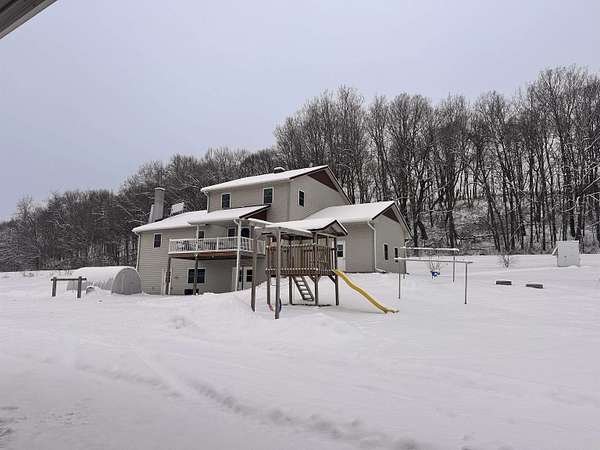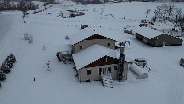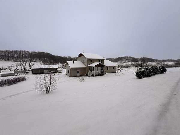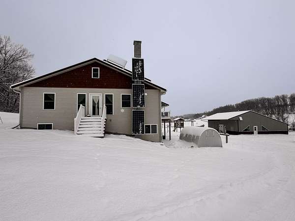 If you like quiet this is it! In the heart of rural WI, this beautifully crafted home built in 2020 offers over 3,000 sq ft of comfortable living space surrounded by 5+ acres of peaceful countryside-additional land available for sale. The home features maple cabinetry, large kitchen island, hickory stairs, & engineered hardwood flooring throughout. Enjoy winter comfort w/ in-floor radiant heat on all levels, powered by a wood boiler in the LL that serves a Pro-Tect water system. The property operates on a 12-volt solar system w/ no conventional electrical service, seller willing to install electric meter on home prior to close. Outbuildings include a 30x50 shed with a 14-ft lean-to, a 12x30 insulated shop, and a cold-storage pole building, providing excellent space for storage, equipment, or hobby use. A great opportunity for buyers seeking country living, acreage includes a stream for watering year around animals, an ideal location in Central Wisconsin, Driftless Region.