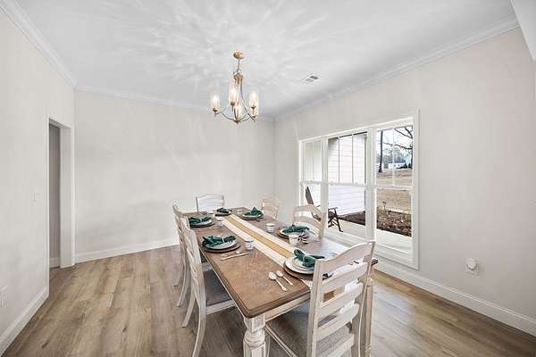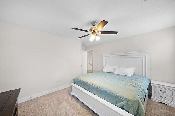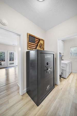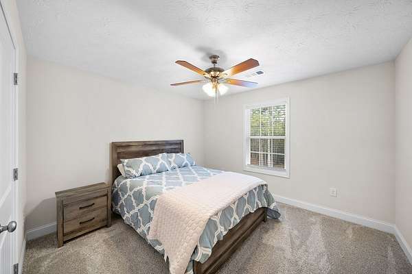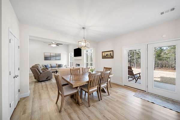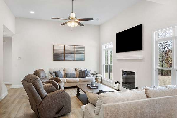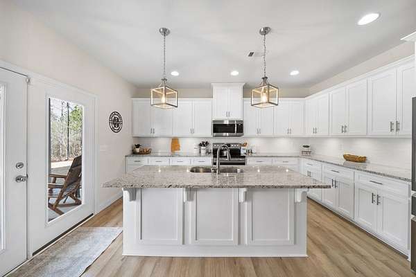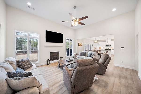 Welcome to this beautifully maintained home, built in 2022 and set on a private 3.33-acre lot. Offering 2,753 square feet of thoughtfully designed living space, this 4-bedroom, 2.5-bath residence combines modern finishes with functional comfort. The primary suite is conveniently located on the main level and features a spa-inspired bathroom with quartz countertops, a tiled walk-in shower, a separate soaking tub, and a spacious walk-in closet. Durable LVP and plush carpet flooring flow throughout the home. The open-concept kitchen is ideal for both everyday living and entertaining, showcasing granite countertops and seamless views into the main living area, highlighted by an electric fireplace. A dedicated dining area provides additional space for gatherings. Additional features include a two-car garage with an in-floor storm shelter, a pole barn, and a separate shed-perfect for storage, hobbies, or equipment. The home is also equipped with an ADT security system and exterior cameras for added peace of mind. Enjoy the privacy and versatility of acreage living while still benefiting from a modern, move-in-ready home.