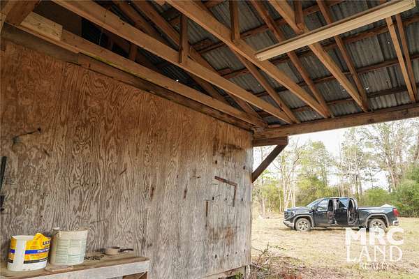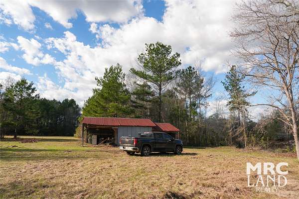 An old fishing shed with power already in place still stands at the river's edge, a nostalgic structure that could be rehabbed into a rustic weekend retreat by the right DIYer.