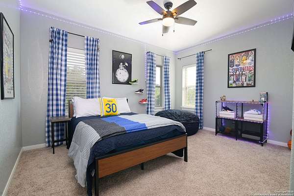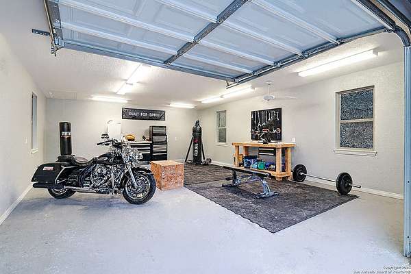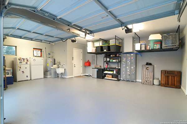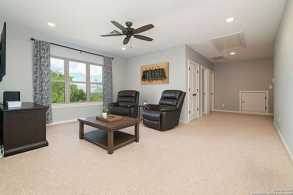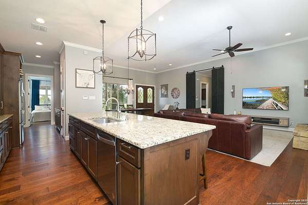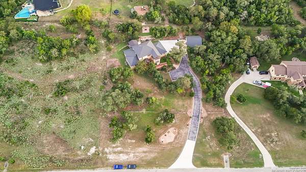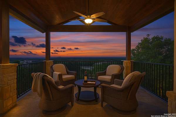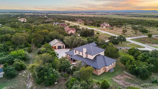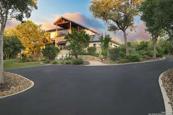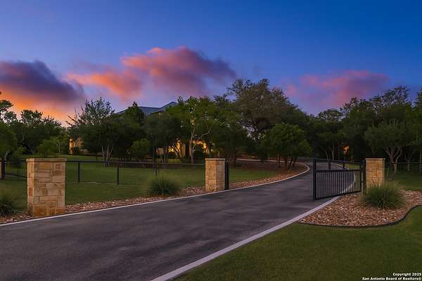 Assumable 4.375 VA loan! San Antonio luxury meets Hill Country charm in this immaculate custom home on 1.5 acres in gated Ridgeview Ranch. The stone & stucco exterior, standing seam roof, and private electric gate set the stage for elegance and privacy. Inside, hardwood floors, crown molding, and soaring ceilings frame an open layout with a dramatic floor-to-ceiling stone fireplace and walls of windows. The chef's kitchen features granite counters, custom cabinetry, subway tile backsplash, pendant lighting, breakfast bar seating, and a double butler's pantry. The downstairs primary suite offers patio access, tray ceiling, a spa bath with clawfoot tub, oversized tiled shower, dual vanities, and a walk-in closet with hidden safe. A private study with custom shelving doubles as a secondary guest suite, flex space, or gym downstairs. Upstairs includes 2 bedrooms, a full bath with dual sinks, and a spacious game room opening to a covered balcony with cedar beams and sweeping Hill Country views. Outdoor living includes a covered patio, hot tub pavilion, stone firepit lounge, and tiered gardens under mature oaks. Plenty of parking & storage with an attached side-entry 2-car garage, detached finished garage/workshop with plumbing & oversized covered carport. Fully fenced with professionally landscaping & irrigation. No city taxes, mins to Lackland AFB!