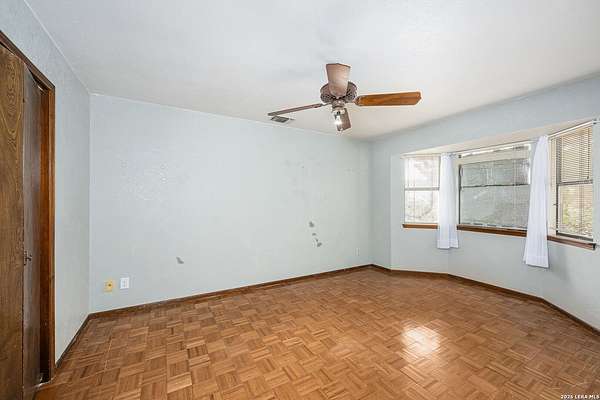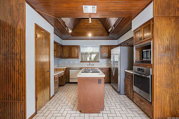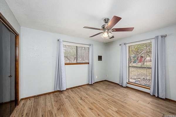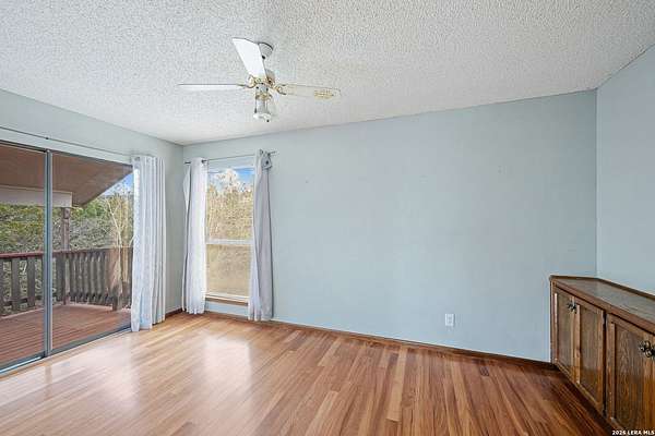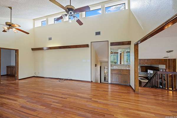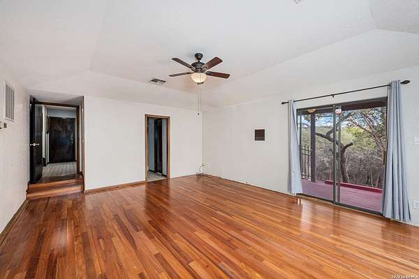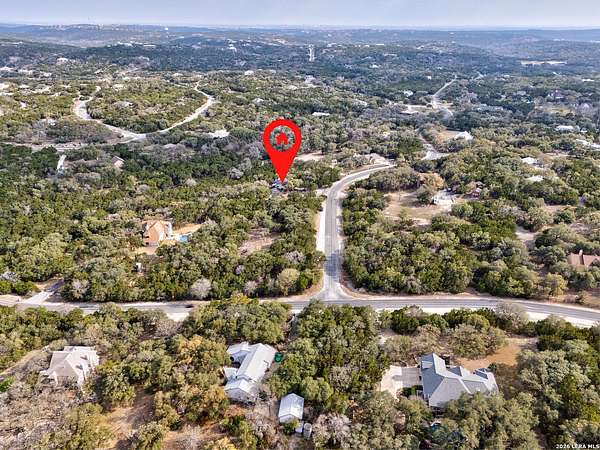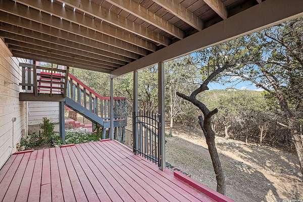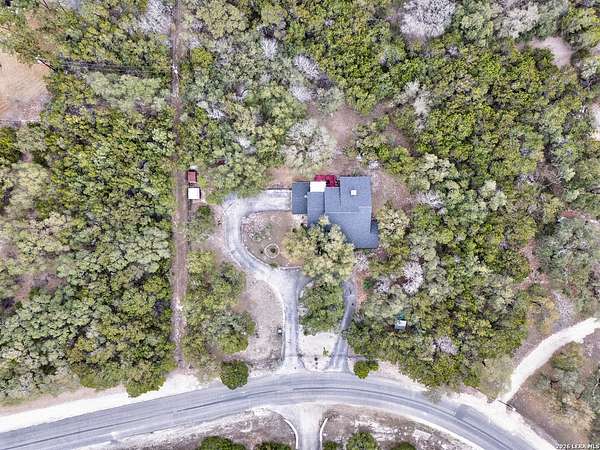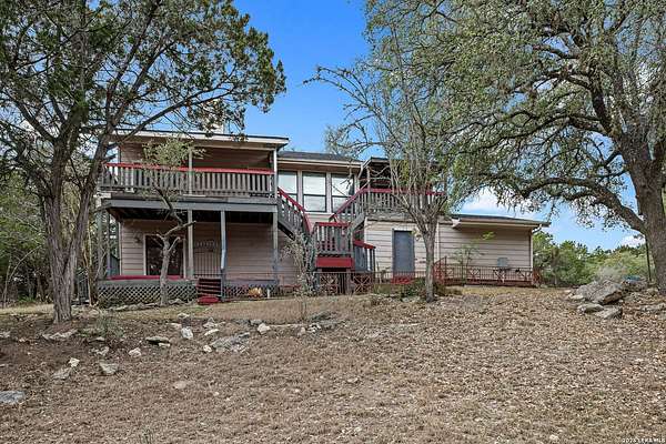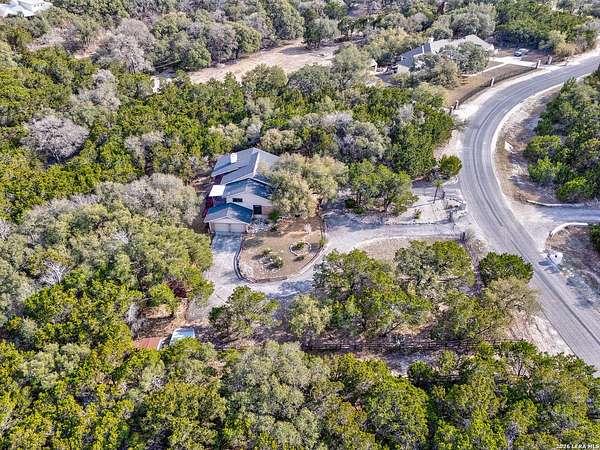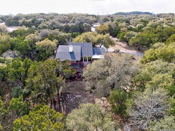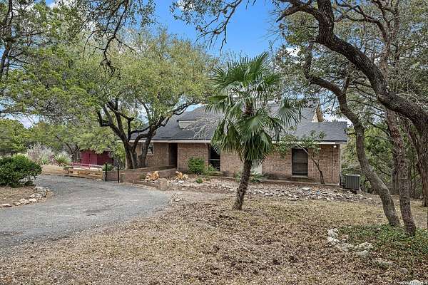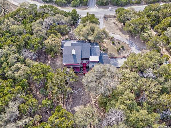 Feel like you are on your own private mountain as you look out over the tree tops. Unique and airy hillside home sits on two and a third tree covered acres in desirable Cross Mountain Ranch. Covered decks off the dining room, family room & study showcase the private sanctuary. Even a deck off the primary bedroom! Hardwood floors throughout level two and on stairs! Wood ceilings in primary bath & kitchen! Dual closets in primary bath. Soaring ceiling include clearstory windows in family room with cozy, brick, corner fireplace. Utility sink in laundry room. Entry is on level two - the main level. Level one holds private, primary bedroom suite with dual closets, separate Roman shower & tub, outside access and also the side entry two-car garage. Family room, formal dining and study with even better views on level three. Live oak studded yard contains several outbuildings including a greenhouse! Surrounding properties sell for much more than asking price, which reflects the updating needed in the home.