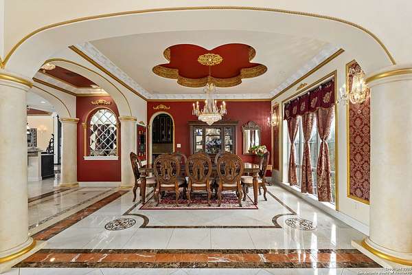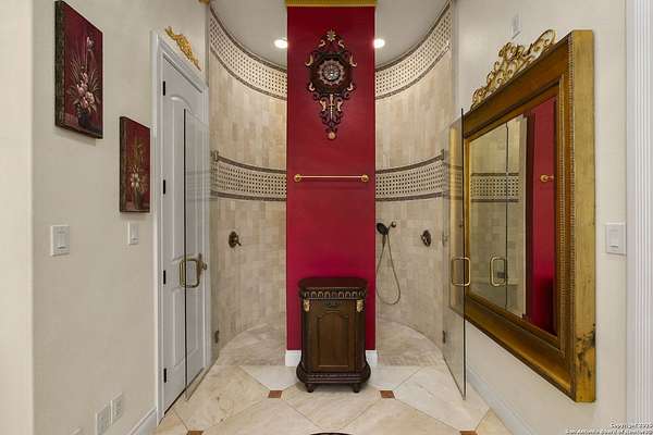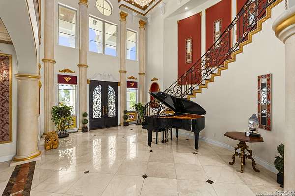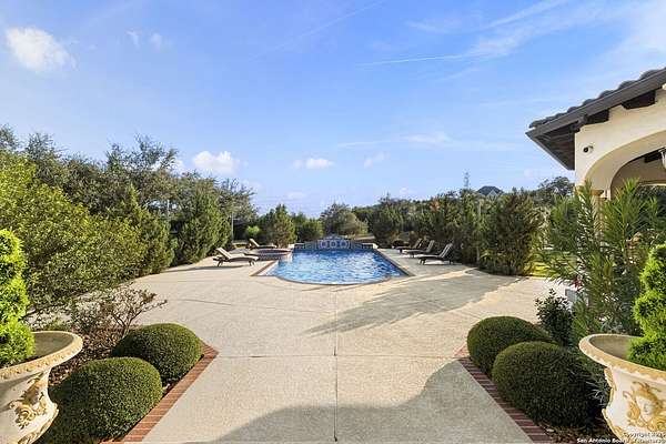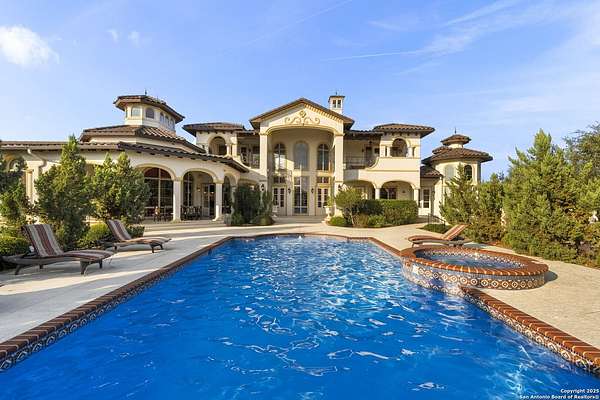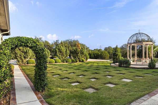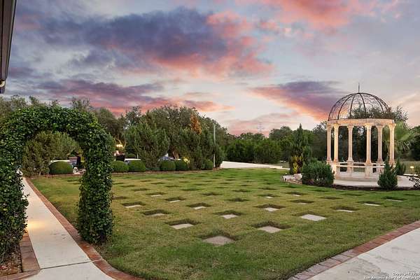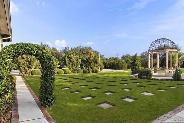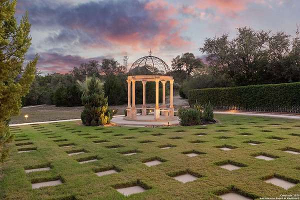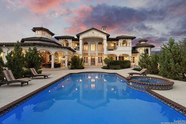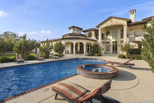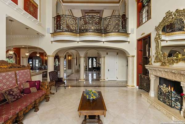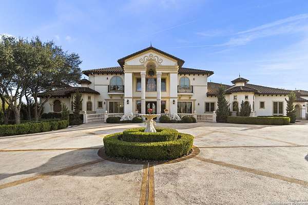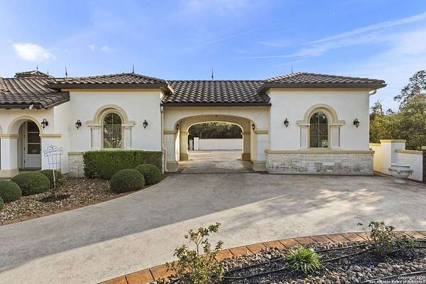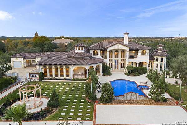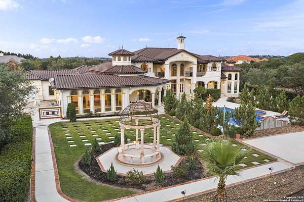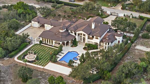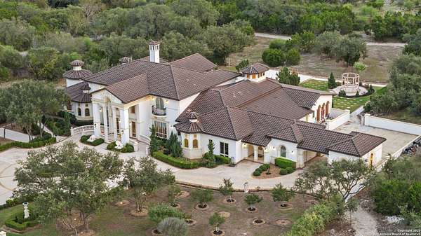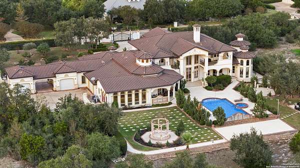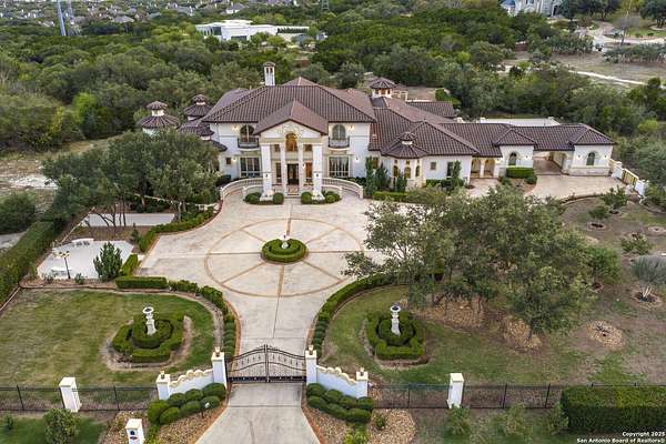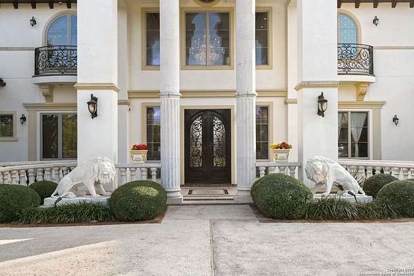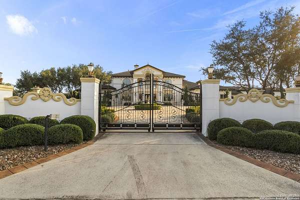Located behind a guarded neighborhood entry, this exceptional Stone Oak estate offers resort-style living on just under 5 private fenced acres. The home features a grand entry room with marble flooring throughout the main level, an Egyptian marble fireplace, custom cabinetry, and genuine Schonbek chandeliers. All 6 bedrooms have huge walk-in custom closets. Upstairs showcases imported hardwood flooring with hand-crafted Polish border designs and multiple rooms accented with specialty tilework, including recycled glass and artisan tiles from Mexico. The home includes two designer powder rooms, stained-glass windows with beautiful morning light, a dedicated media room with multi-level theater seating and a 100" display, wet and dry bars, a private gym, wrought iron work throughout the home and a secured control room for the whole-home audio and security systems. Interior and exterior sound system makes entertaining a breeze. Outdoor amenities are exceptional, featuring a resort-style pool and spa with lighting and water features, pink marble gazebo, granite fire pit with built-in seating, Four Seasons marble statues, and an expansive entertainment terrace ideal for outdoor movies, events, or pickleball. Additional highlights include a custom outdoor BBQ area, private lounge off the primary suite, walking/jogging path around the property, and an octagonal front courtyard with carved benches and an armillary centerpiece. The property also offers a large multipurpose room that can host up to 25 guests, a sunroom for art or meditation, and four oversized garages with extensive built-in storage. Energy efficient lighting and an efficient irrigation system helps keep the utility bills low. This is truly a Stone Oak masterpiece.