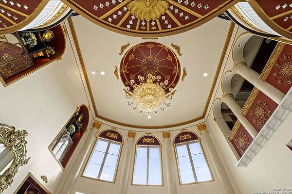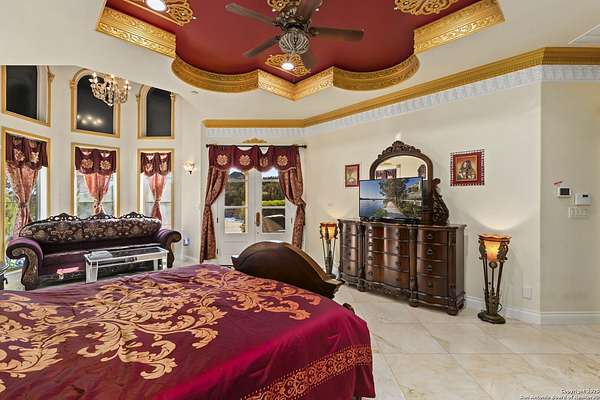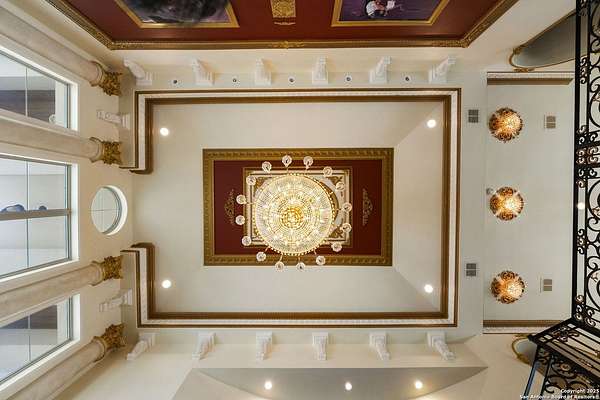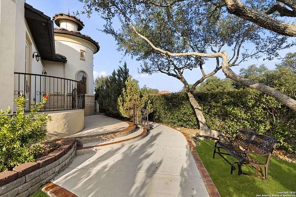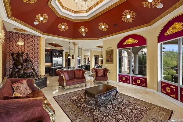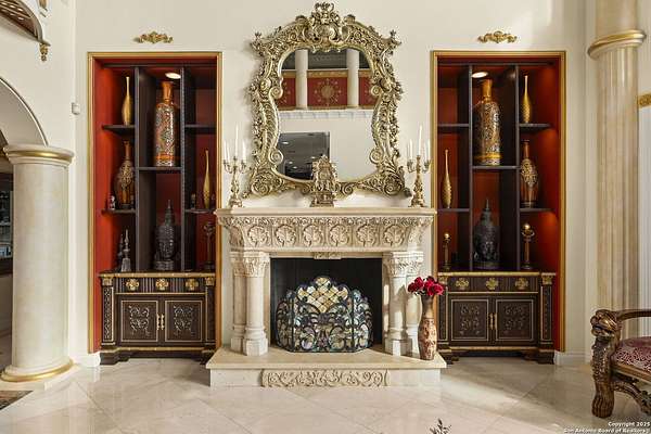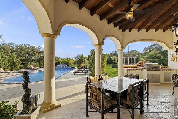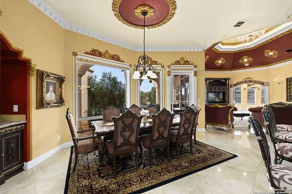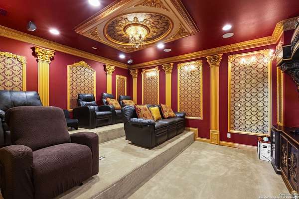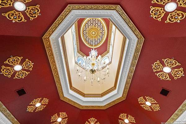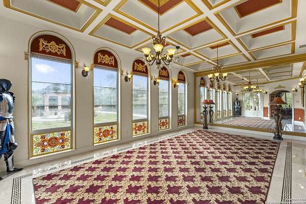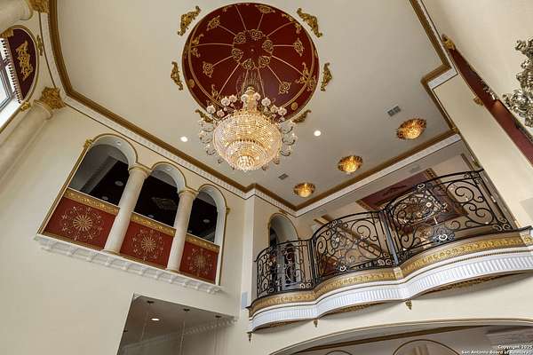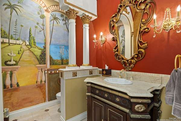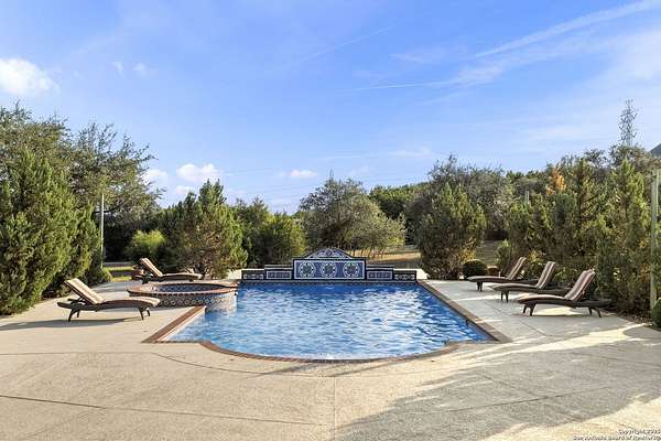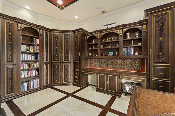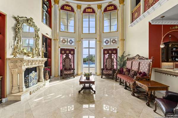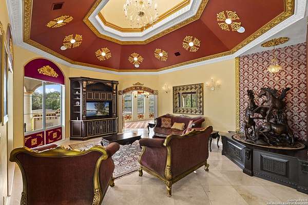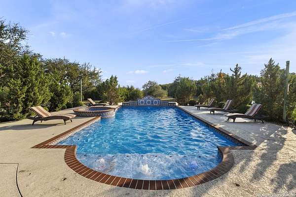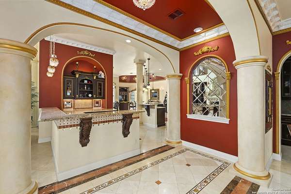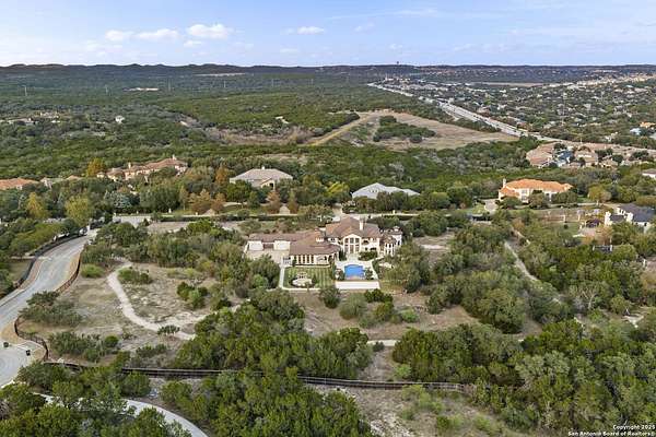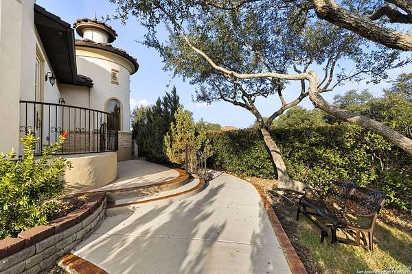 Located behind a guarded neighborhood entry, this exceptional Stone Oak estate offers resort-style living on just under 5 private fenced acres. The home features a grand entry room with marble flooring throughout the main level, an Egyptian marble fireplace, custom cabinetry, and genuine Schonbek chandeliers. All 6 bedrooms have huge walk-in custom closets. Upstairs showcases imported hardwood flooring with hand-crafted Polish border designs and multiple rooms accented with specialty tilework, including recycled glass and artisan tiles from Mexico. The home includes two designer powder rooms, stained-glass windows with beautiful morning light, a dedicated media room with multi-level theater seating and a 100" display, wet and dry bars, a private gym, wrought iron work throughout the home and a secured control room for the whole-home audio and security systems. Interior and exterior sound system makes entertaining a breeze. Outdoor amenities are exceptional, featuring a resort-style pool and spa with lighting and water features, pink marble gazebo, granite fire pit with built-in seating, Four Seasons marble statues, and an expansive entertainment terrace ideal for outdoor movies, events, or pickleball. Additional highlights include a custom outdoor BBQ area, private lounge off the primary suite, walking/jogging path around the property, and an octagonal front courtyard with carved benches and an armillary centerpiece. The property also offers a large multipurpose room that can host up to 25 guests, a sunroom for art or meditation, and four oversized garages with extensive built-in storage. Energy efficient lighting and an efficient irrigation system helps keep the utility bills low. This is truly a Stone Oak masterpiece.
