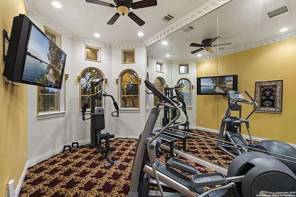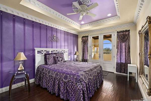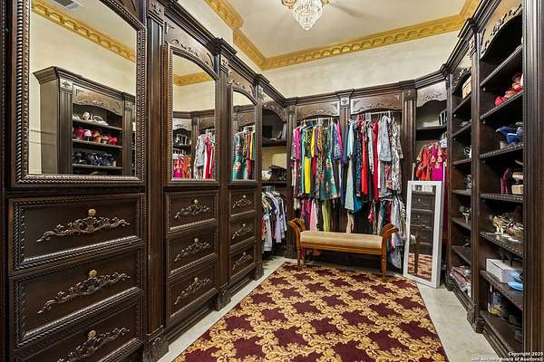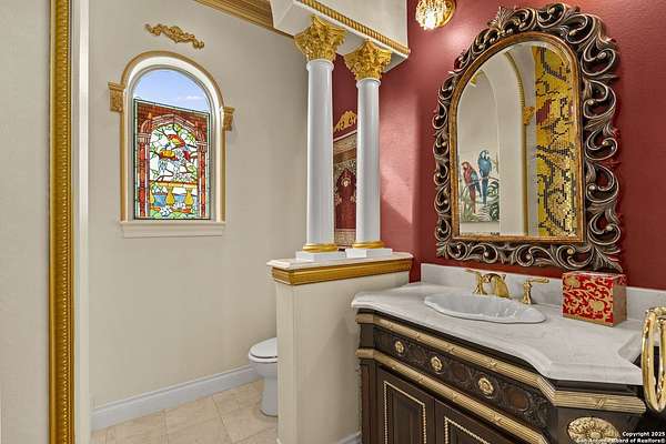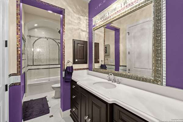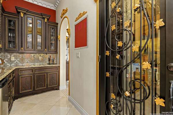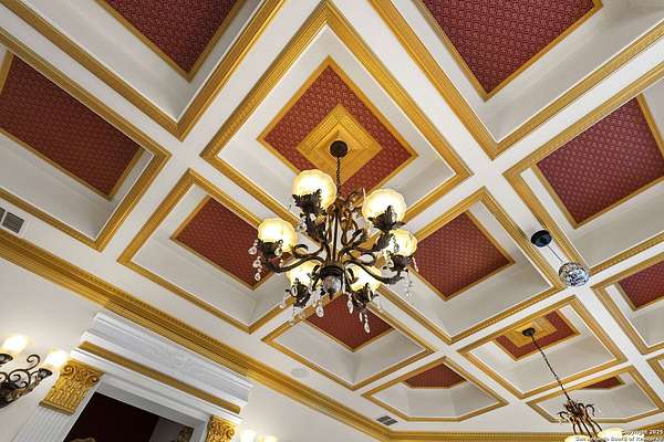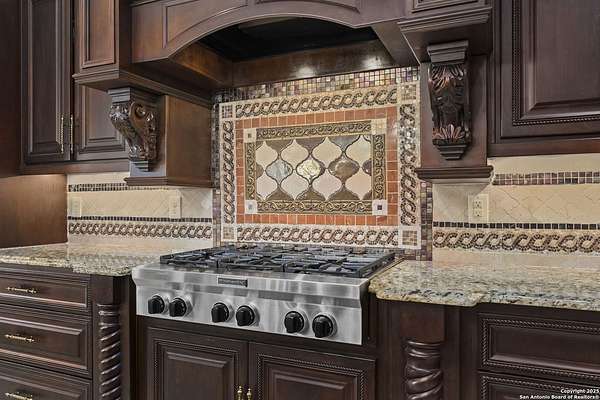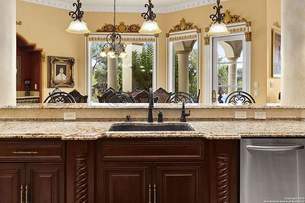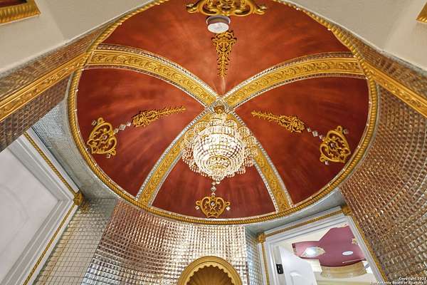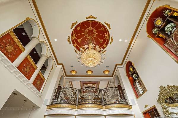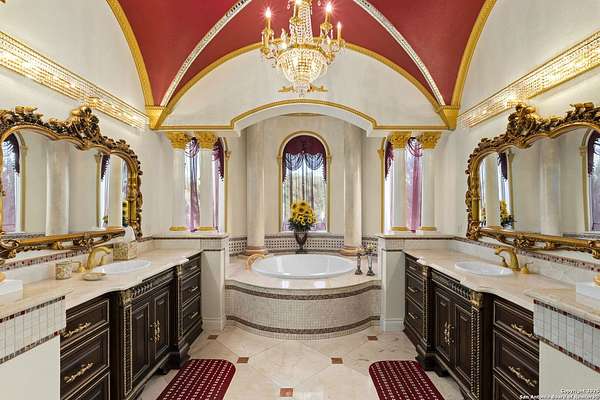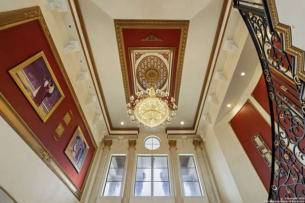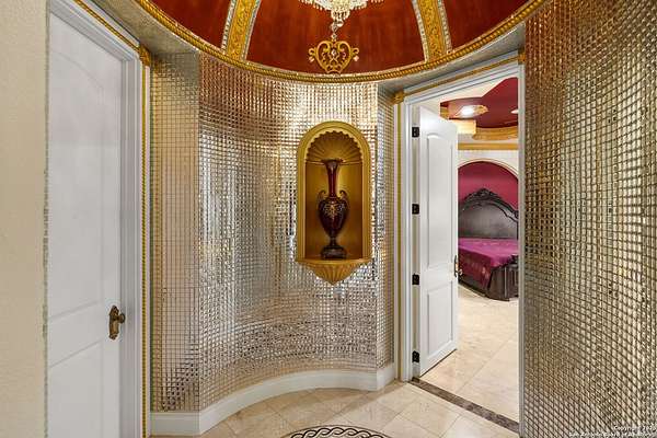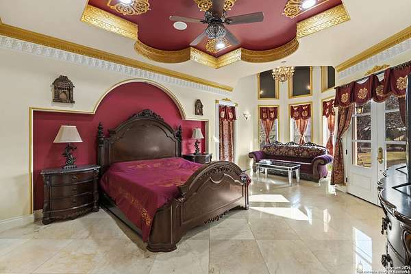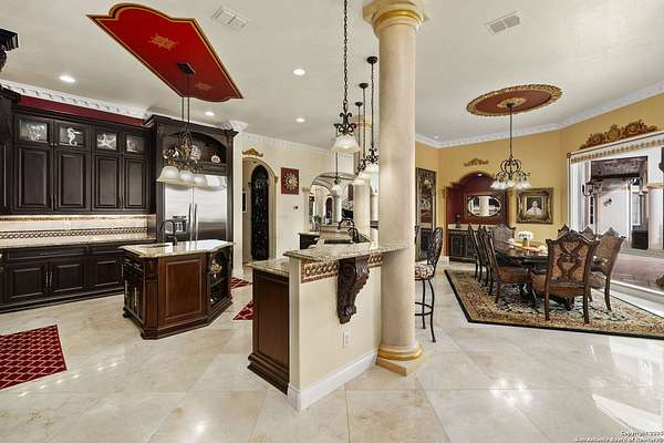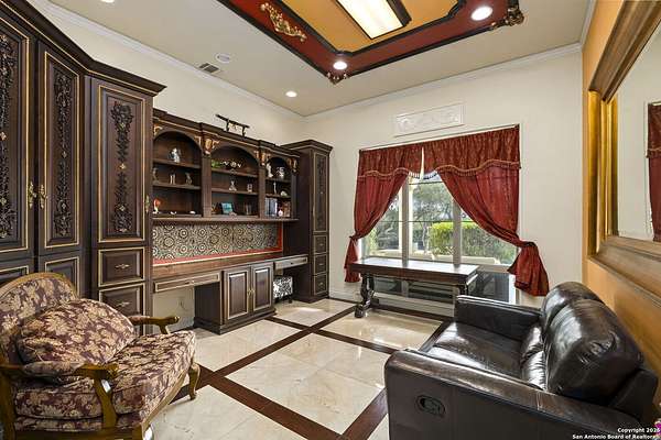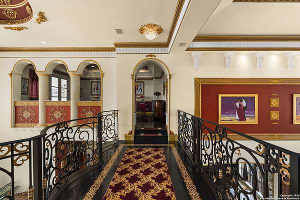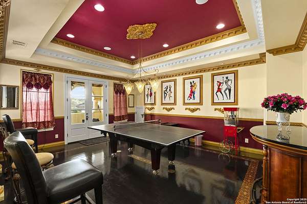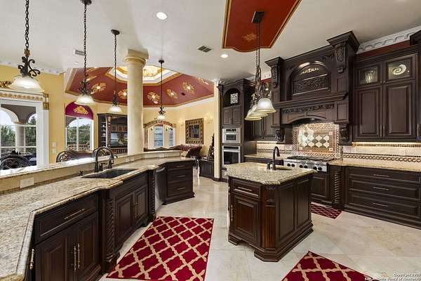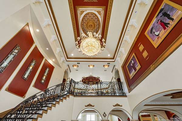 Located behind a guarded neighborhood entry, this exceptional Stone Oak estate offers resort-style living on just under 5 private fenced acres. The home features a grand entry room with marble flooring throughout the main level, an Egyptian marble fireplace, custom cabinetry, and genuine Schonbek chandeliers. All 6 bedrooms have huge walk-in custom closets. Upstairs showcases imported hardwood flooring with hand-crafted Polish border designs and multiple rooms accented with specialty tilework, including recycled glass and artisan tiles from Mexico. The home includes two designer powder rooms, stained-glass windows with beautiful morning light, a dedicated media room with multi-level theater seating and a 100" display, wet and dry bars, a private gym, wrought iron work throughout the home and a secured control room for the whole-home audio and security systems. Interior and exterior sound system makes entertaining a breeze. Outdoor amenities are exceptional, featuring a resort-style pool and spa with lighting and water features, pink marble gazebo, granite fire pit with built-in seating, Four Seasons marble statues, and an expansive entertainment terrace ideal for outdoor movies, events, or pickleball. Additional highlights include a custom outdoor BBQ area, private lounge off the primary suite, walking/jogging path around the property, and an octagonal front courtyard with carved benches and an armillary centerpiece. The property also offers a large multipurpose room that can host up to 25 guests, a sunroom for art or meditation, and four oversized garages with extensive built-in storage. Energy efficient lighting and an efficient irrigation system helps keep the utility bills low. This is truly a Stone Oak masterpiece.