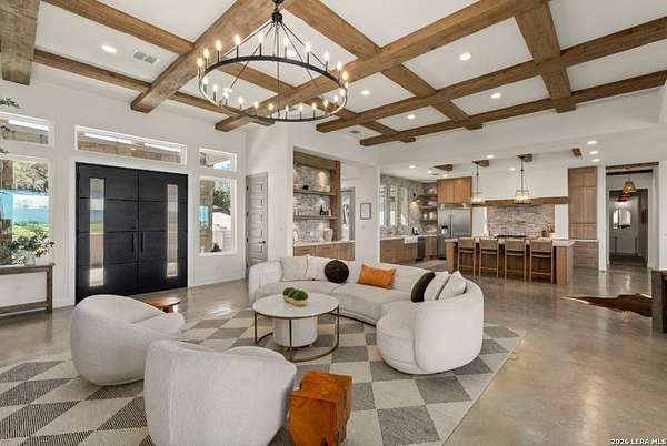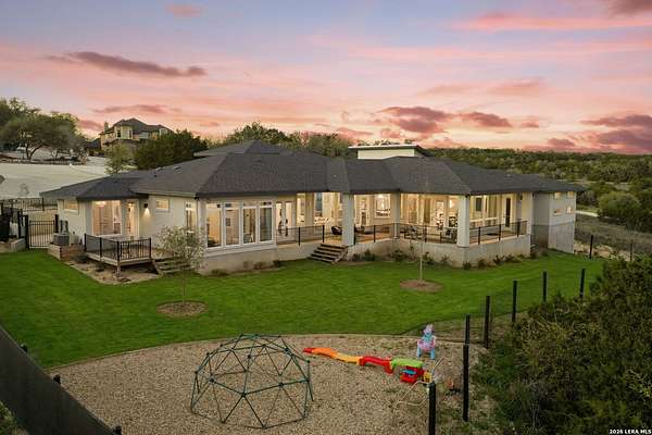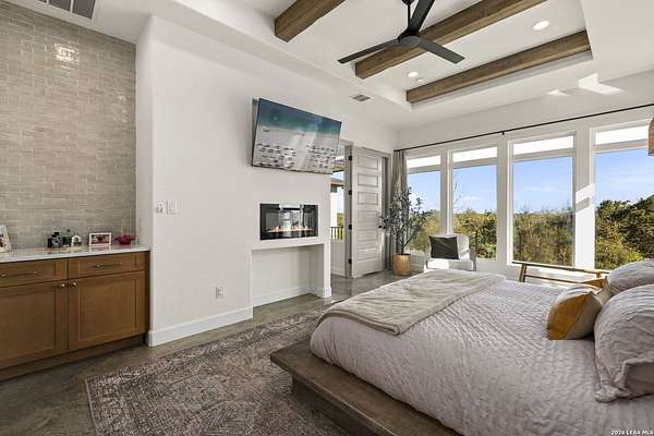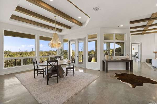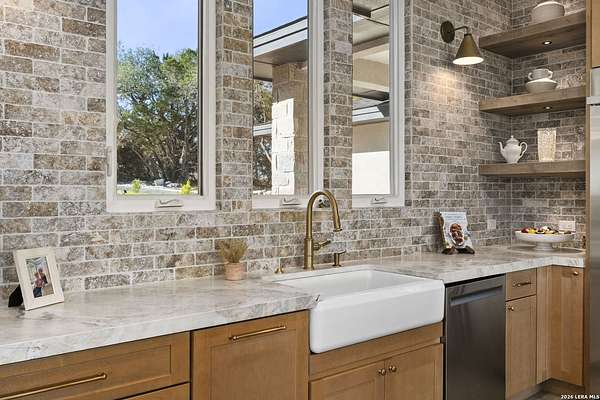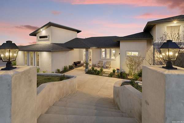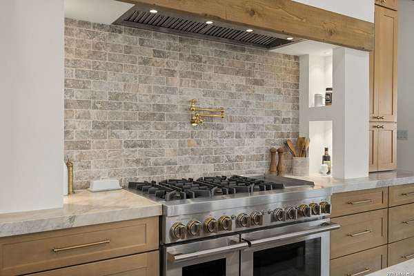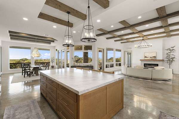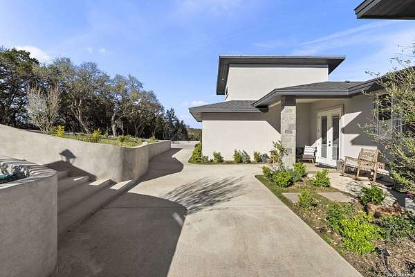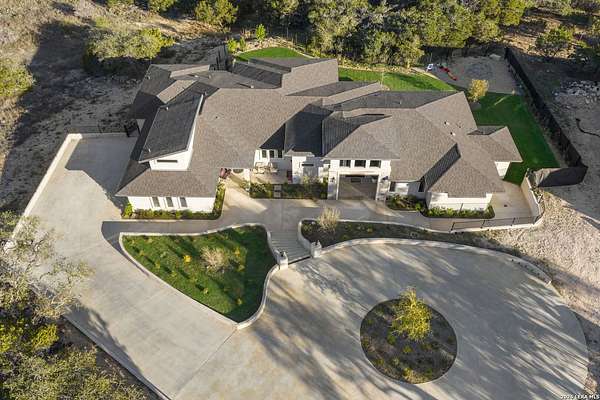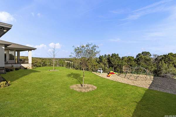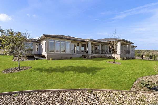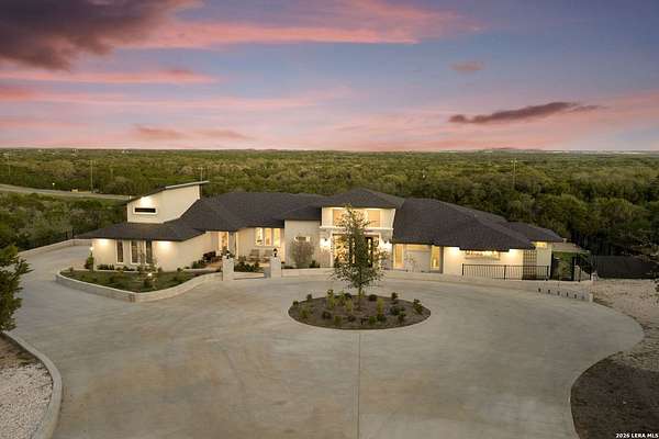 Hill Country Luxury | Custom Home with Sweeping Views in Ramble Ridge Stunning and move in ready! Completed in 2025, this meticulously crafted custom home sits on a scenic 1.66acre lot in the gated community of Ramble Ridge. Despite feeling like a private retreat, it's no more than 10 minutes from local highways and shops. A massive estate style driveway with a 20 ft roundabout provides effortless access to the three car garage and plenty of guest parking. Mature oak trees and solar accent lighting add evening ambiance. A custom concrete stairway with illuminated columns lead to grand 8 ft double iron doors. Inside, a soaring great room showcases basketweave wood beams and a fully open concept kitchen, living and dining area with 180 degree scenic views. The chef's kitchen boasts high end marble countertops with a 2 inch custom edge, a 48 inch JennAir range, a matching 48 inch refrigerator, custom cabinets with built in hood, and a thoughtfully designed cook nook with custom lighting and shelves. A bespoke bar area makes this space perfect for entertaining. Down the hall you'll find a custom laundry room with utility sink, quartz counters, abundant cabinetry and space for a secondary fridge. Two secondary bedrooms feature their own bathrooms with walk in showers and closets, plus scenic views. The primary suite serves as a private retreat with custom beams, a huge walk in shower and soaking tub overlooking the lush yard, a private deck for morning coffee, and an expansive walk in closet with island and quartz countertop. An additional bedroom with walk in closet and detached full bath can flex as a guest suite or a personal gym. The fully fenced, gated backyard is landscaped with mature plants and trees and includes a timer controlled irrigation system and fresh sod. With controlled community access, a low HOA fee and the convenience of being minutes from everyday amenities , this custom estate blends hill country seclusion and modern luxury. Come tour today before it's gone!