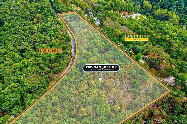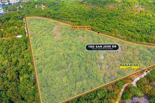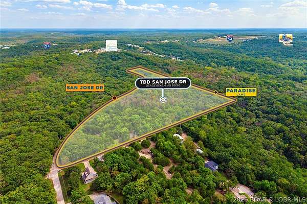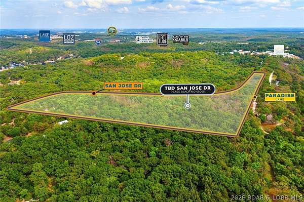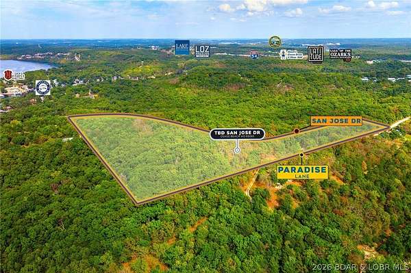Discover nearly 20 acres (19.5+/-) in the heart of Osage Beach, perfectly positioned just off Hwy 54 near Runabout Drive. This versatile tract offers the ideal blend of accessibility and seclusion, making it well-suited for development, a private retreat, or recreational enjoyment. Enjoy close proximity to medical facilities, shopping, dining, and entertainment, along with convenient access to public lake entry and everything Lake of the Ozarks has to offer. The property provides a peaceful, private setting without sacrificing the benefits of a central location. With blacktop road frontage on both San Jose Drive and Paradise Lane, access is easy and infrastructure is already in place for future plans. Opportunities like this-offering size, location, and flexibility-are rare in Osage Beach.