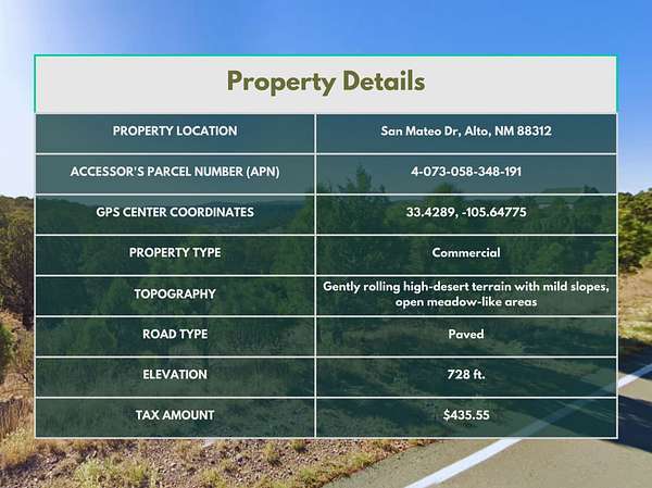 This 6.6-acre commercial parcel is located on San Mateo Dr in The Ranches of Sonterra in Alto, New Mexico, offering a rare opportunity to own spacious land in one of Lincoln County's most scenic high-desert regions. The property provides wide open space, natural surroundings, and flexibility for commercial or mixed-use development, making it well-suited for business ventures, recreation, or long-term investment.