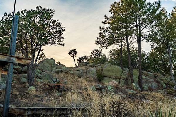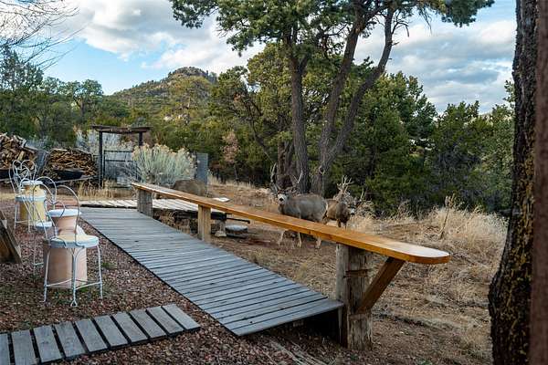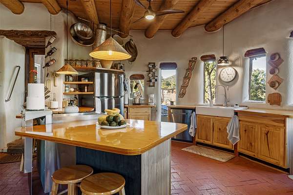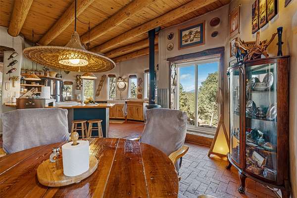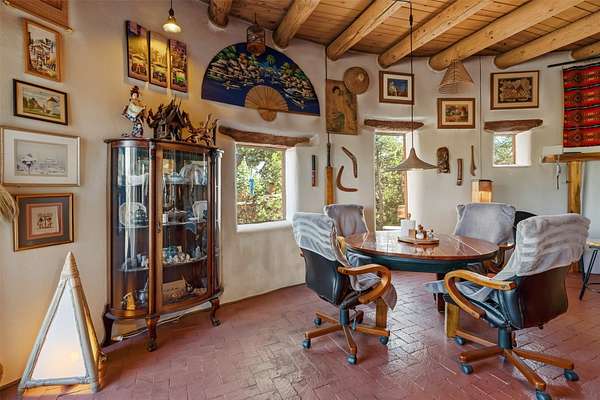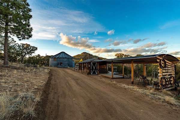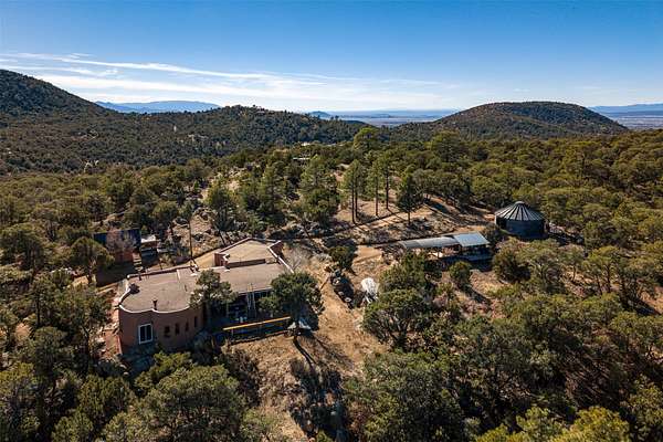 Perched along the historic Old Santa Fe Trail at approximately 7,777 feet in elevation, this hilltop residence spans ten peaceful acres with sweeping high desert views in every direction. Expansive skies, mature trees, and a wraparound vantage point create unforgettable sunsets and panoramic scenery from the elevated deck. The three bedroom, two and one half bath home has been carefully maintained and thoughtfully crafted with traditional Southwest character. Exposed vigas, handcrafted wood details, wood burning fireplaces, and generous windows invite warmth and natural light throughout the open living, dining, and kitchen areas. A welcoming gathering space near the entry sets the tone for celebrations and relaxed entertaining. A separate studio offers privacy for artistic or professional pursuits. Additional structures include a detached garage with barn and workshop space, plus an auxiliary outbuilding and covered parking area that add flexibility and utility. With approximately 3,000 square feet of living space, the floor plan offers the possibility of creating two distinct one bedroom living quarters, opening the door to income potential or comfortable guest accommodations. The land is served by a private well and septic system and may be split into two five acre parcels, providing future options. Surrounded by trails for hiking and cycling, yet only minutes from the Plaza, dining, and cultural destinations, this property offers both seclusion and accessibility. Equipment such as a tractor, implements, generator, and many operational tools related to the upkeep of the land may be available by separate consideration. This is an opportunity for the next steward to continue its legacy. Culmination of ownership is desired, expressions of interest are invited, all reasonable inquiries and sincere offers entertained.