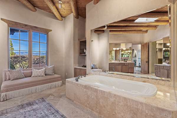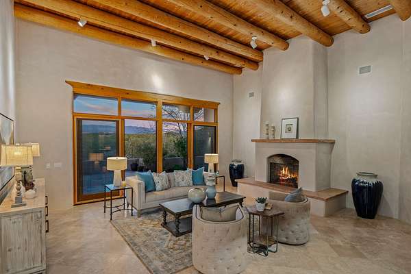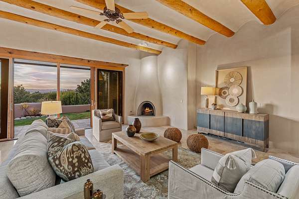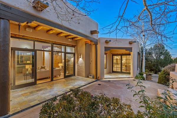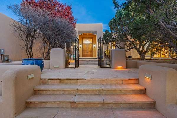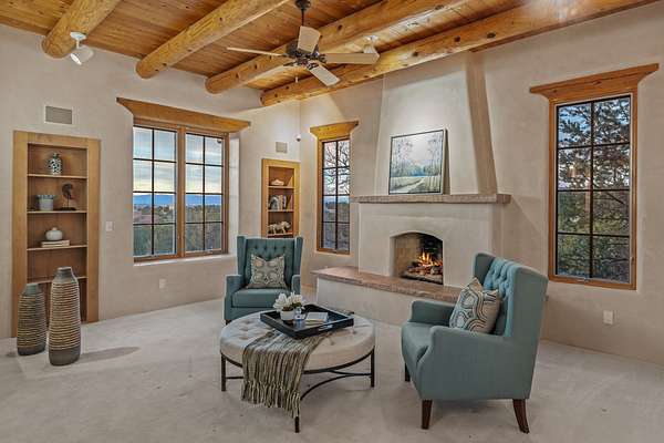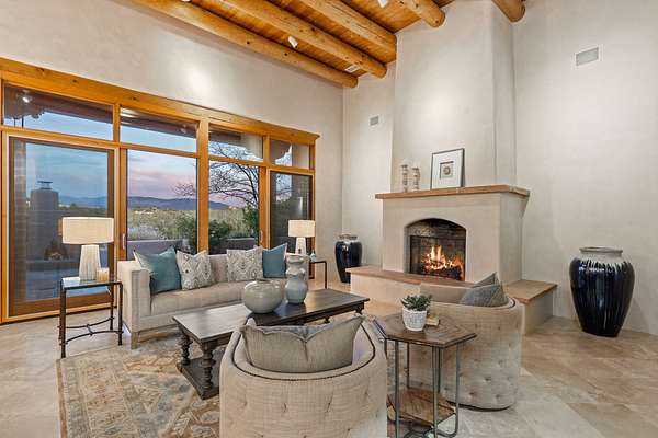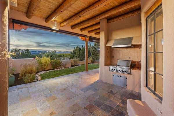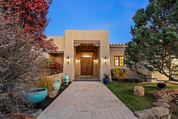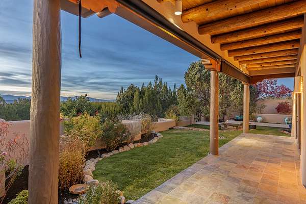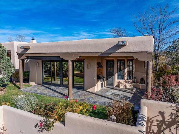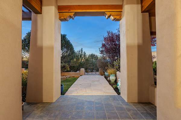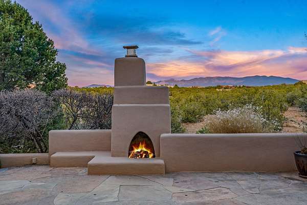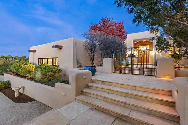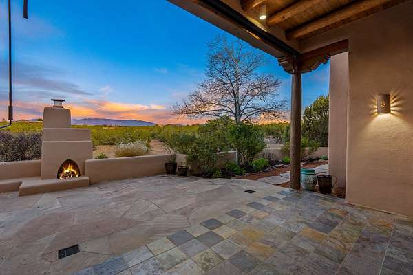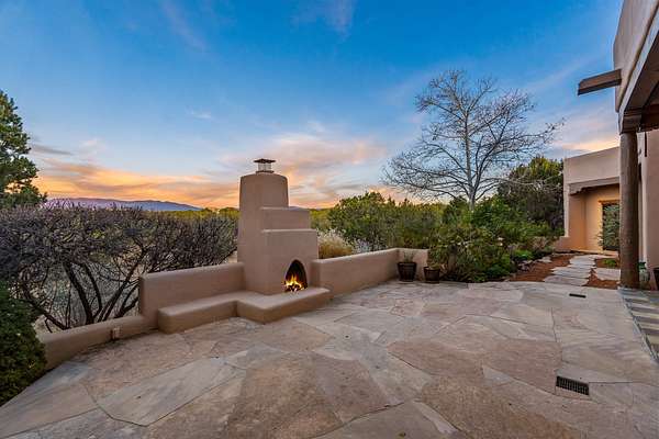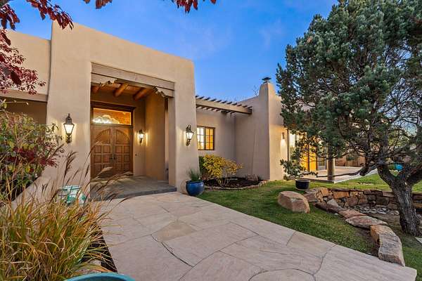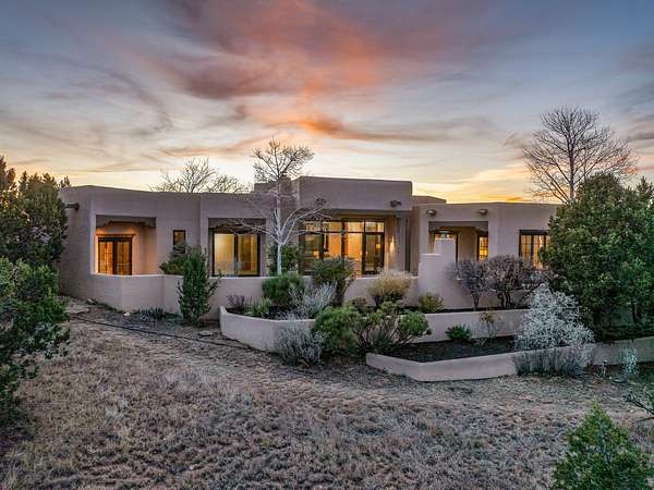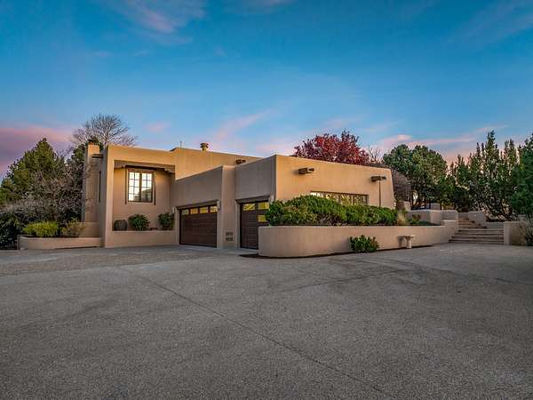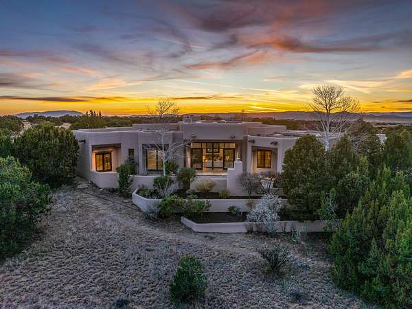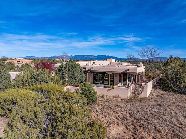 Remarkable and spacious Pueblo Style Home perfectly situated on a premium 3.51 acre +/- lot at the end of a cul-de-sac showcasing panoramic massive Sangre de Cristo and Jemez Mountain views and enclosed gardens! This bright, sun-lit home has an outstanding floor plan with a separated guest wing, large family room off the kitchen, lovely covered outdoor portals with fireplaces, an oversized massive primary suite, and an impressive entry foyer that flows into an expansive great room, perfect for entertaining, and three guest rooms with ensuite bathrooms. The home features a finished garage with A/C/heating split and new garage doors, new outdoor automatic sunshades, new Subzero refrigerator/freezer and Bosch dishwasher, pull out shelving, new designer closets in primary suite, new LED room and closet lighting throughout the home, and newly replaced exterior woodwork.