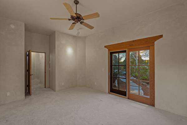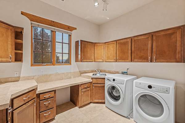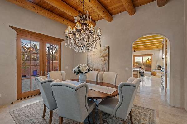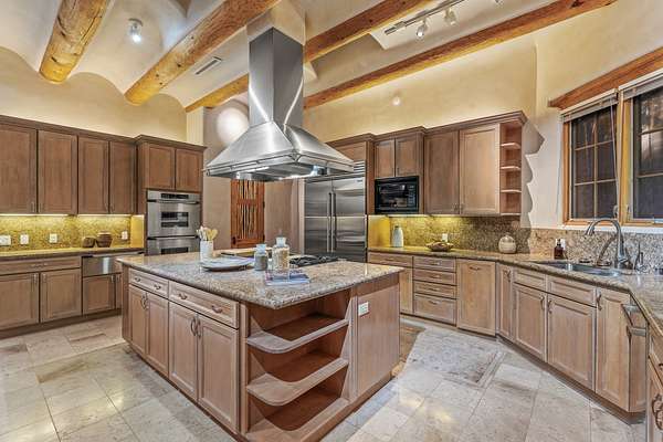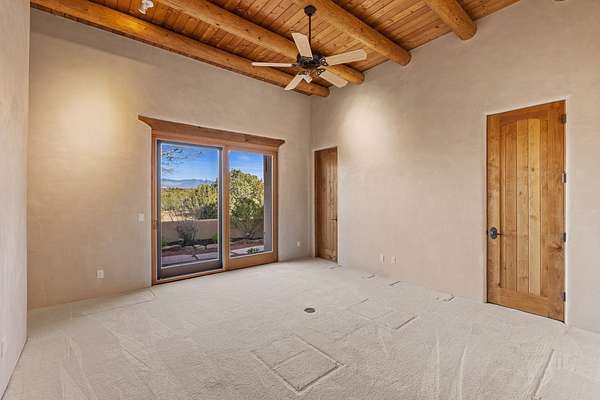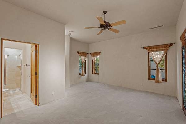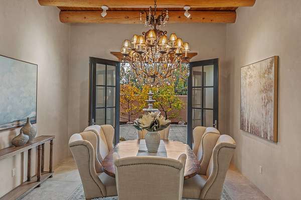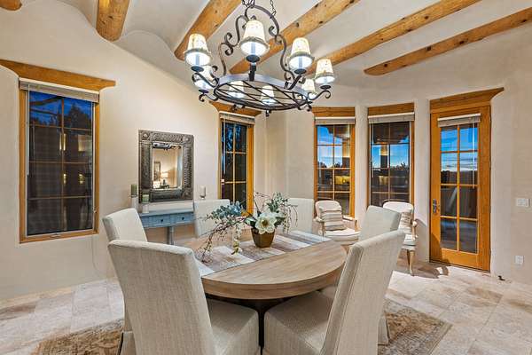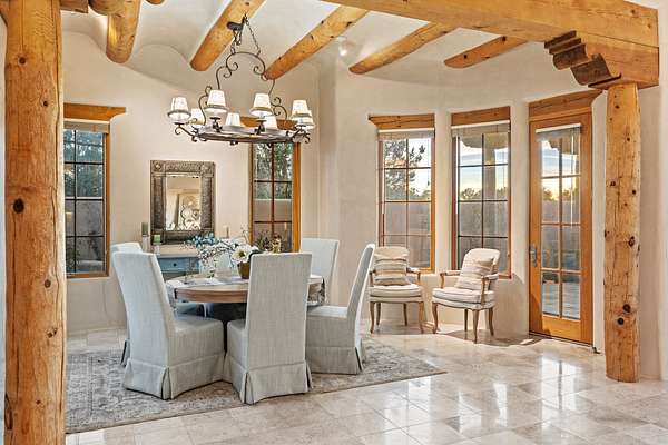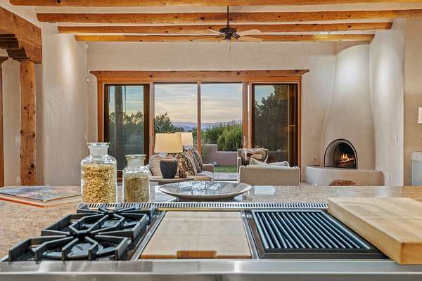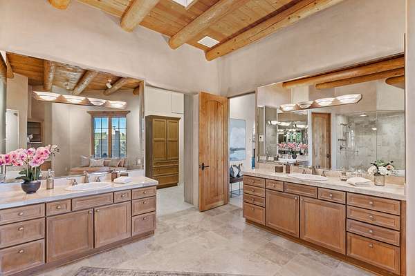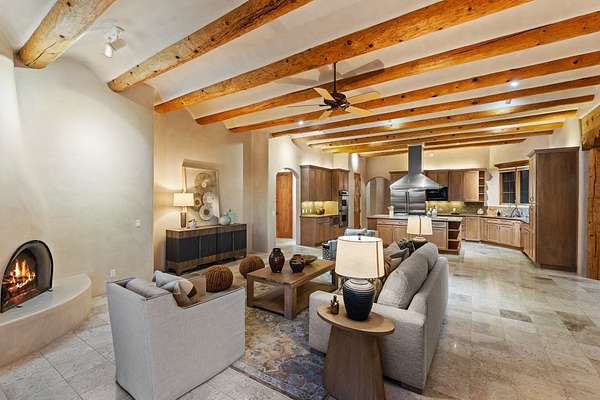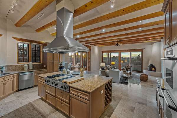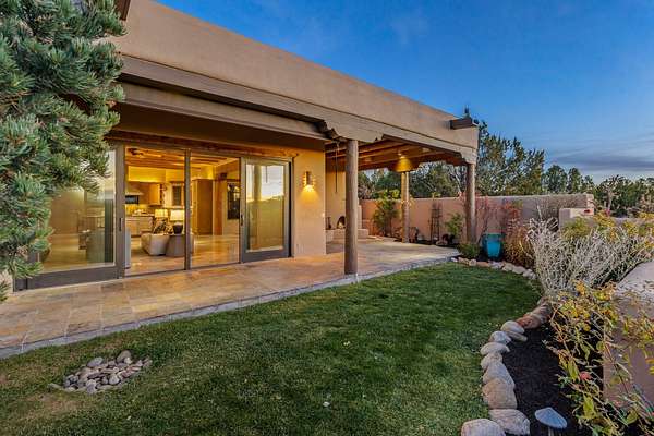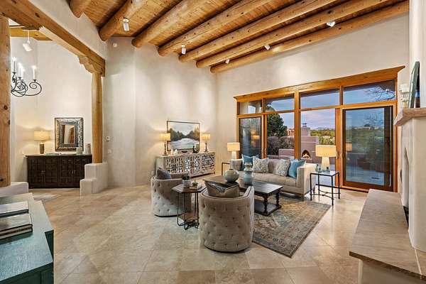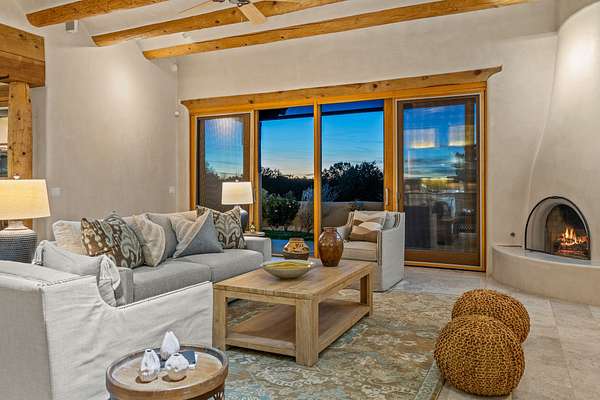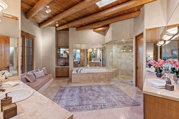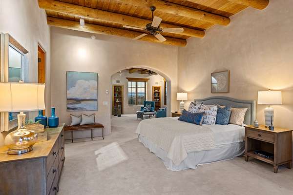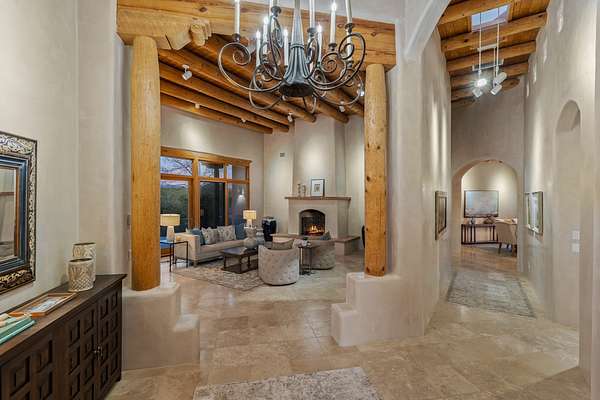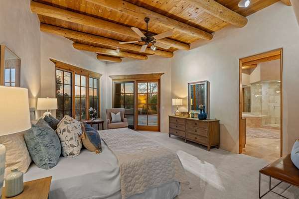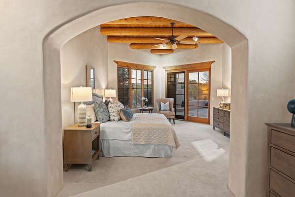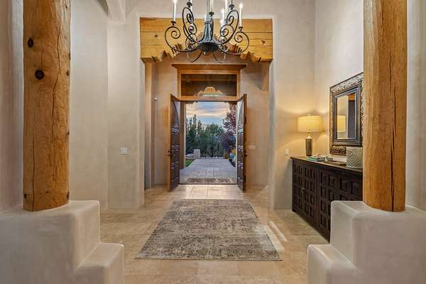 Remarkable and spacious Pueblo Style Home perfectly situated on a premium 3.51 acre +/- lot at the end of a cul-de-sac showcasing panoramic massive Sangre de Cristo and Jemez Mountain views and enclosed gardens! This bright, sun-lit home has an outstanding floor plan with a separated guest wing, large family room off the kitchen, lovely covered outdoor portals with fireplaces, an oversized massive primary suite, and an impressive entry foyer that flows into an expansive great room, perfect for entertaining, and three guest rooms with ensuite bathrooms. The home features a finished garage with A/C/heating split and new garage doors, new outdoor automatic sunshades, new Subzero refrigerator/freezer and Bosch dishwasher, pull out shelving, new designer closets in primary suite, new LED room and closet lighting throughout the home, and newly replaced exterior woodwork.