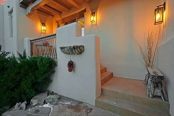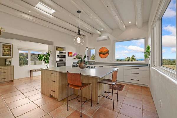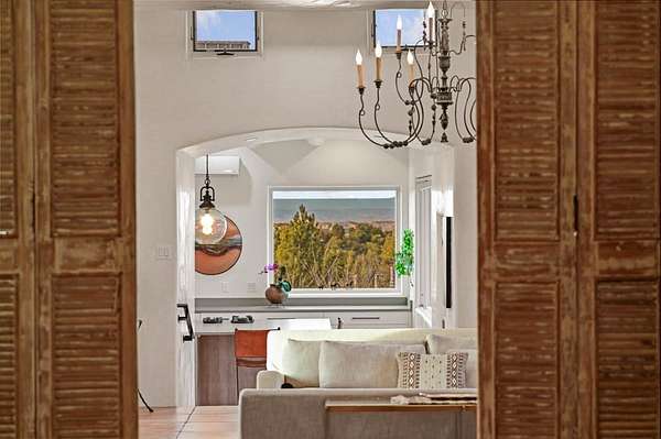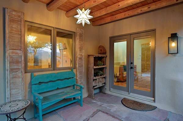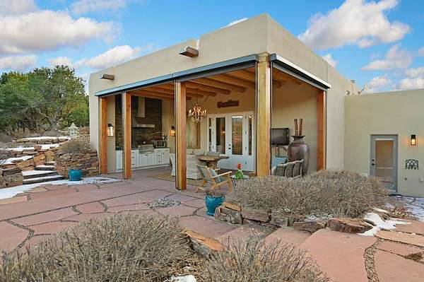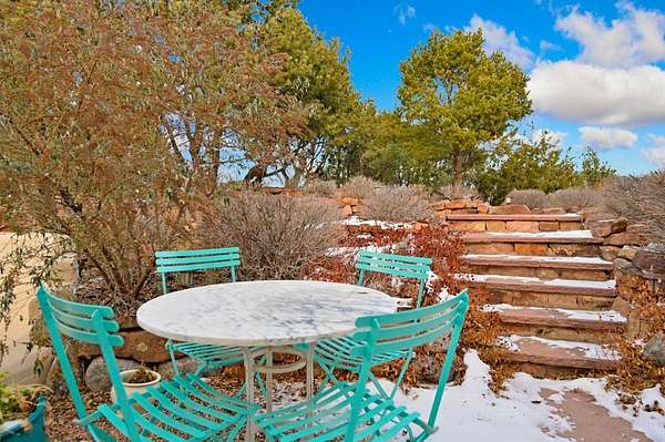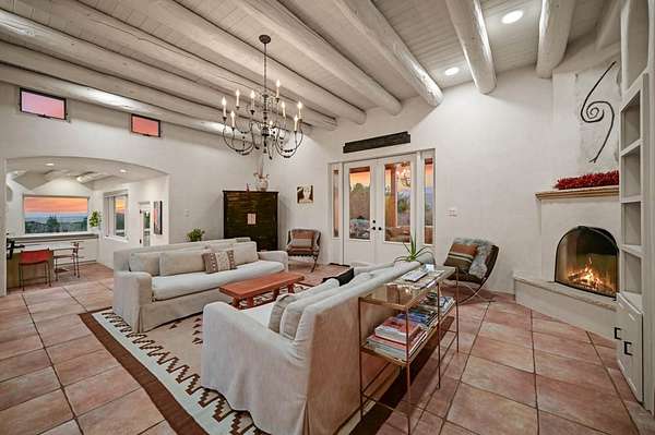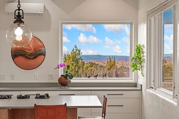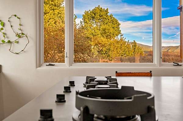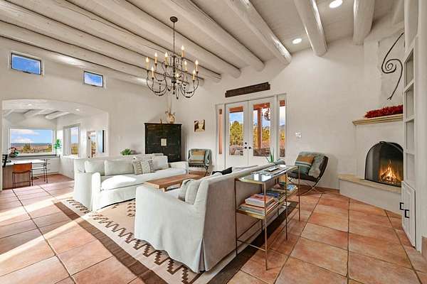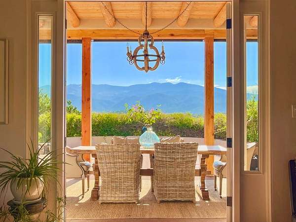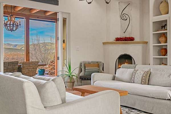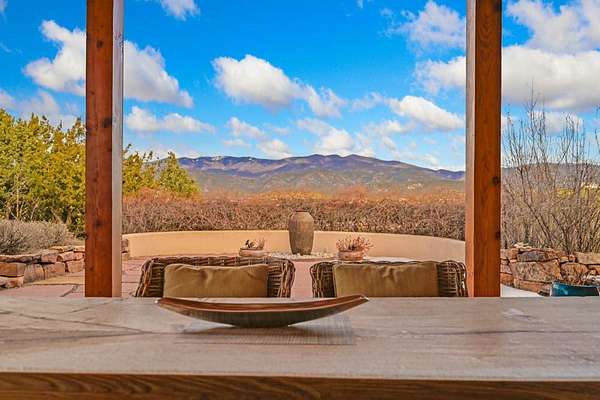 Exceptional mountain views! Beautifully updated Santa Fe home offering classic Southwestern charm and modern amenities. Features include a sun-filled remodeled chef's kitchen with walk-in pantry and an elevator from the oversized 2-car garage for easy access to the secondary refrigerator and multiple storage rooms. The primary suite offers an elegant soaking tub for two and private retreat deck. The two downstairs bedrooms have ensuite bathrooms and an adjoining steam shower, and individual French-door entries that open onto a patio framed by a blooming pollinator's haven. Expansive outdoor living with three distinct portals, the largest fully equipped with a built-in grill and cabinetry for seamless entertaining while enjoying sweeping views of the Sangre de Cristo Mountains, Santa Fe Ski Basin, and Badlands. Located in a private, secure, gated community surrounded by a mature pinon and cedar forest. Approx. 2-acre lot provides peace and serenity, yet you're less than 10 minutes from exceptional culinary spots, the vibrant and historic Santa Fe Plaza, and the world-renowned Santa Fe Opera. Home is in the County and not subject to the Mansion Tax for buyers. Furniture package available.