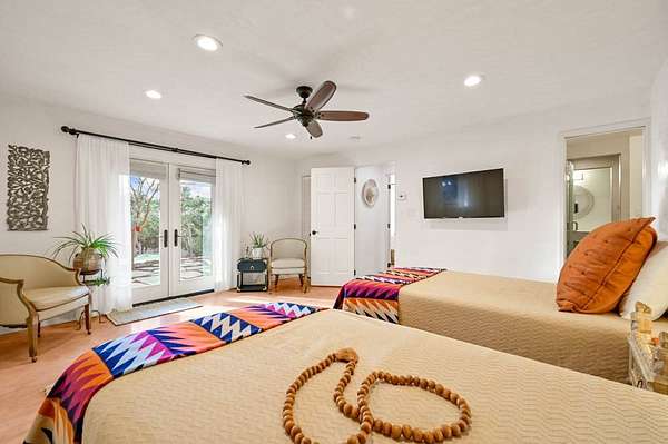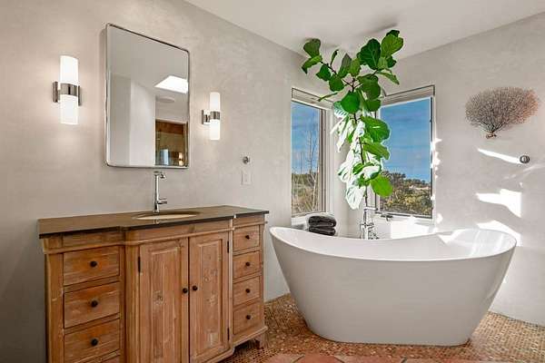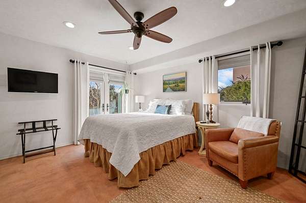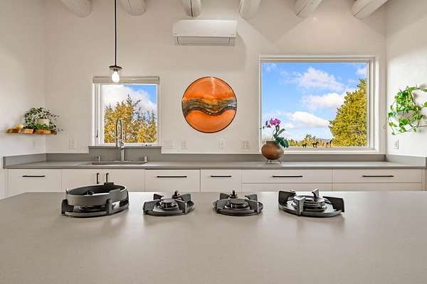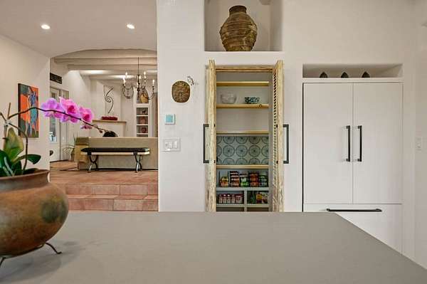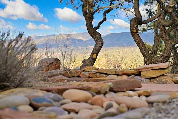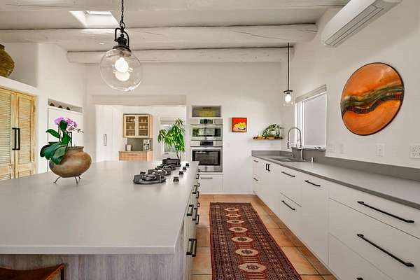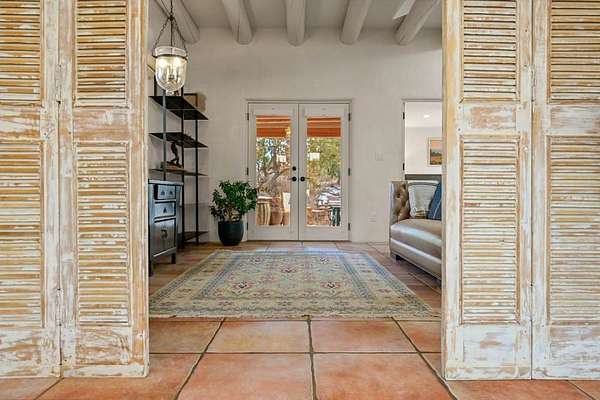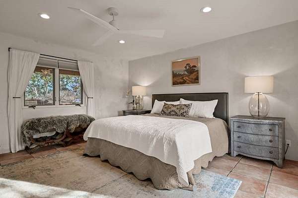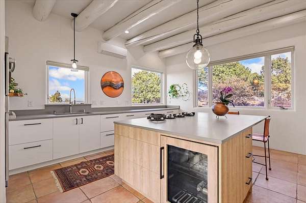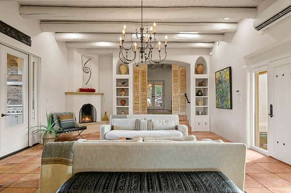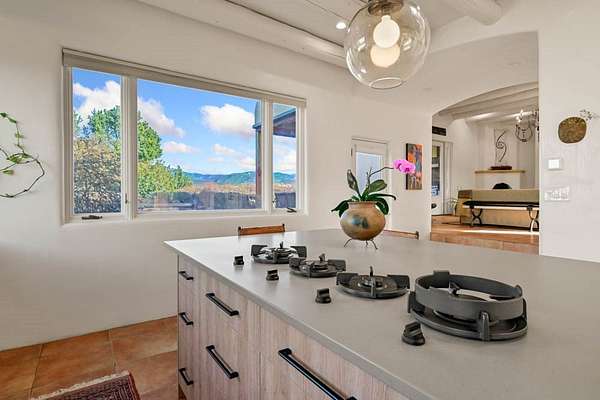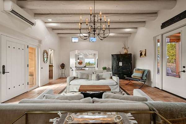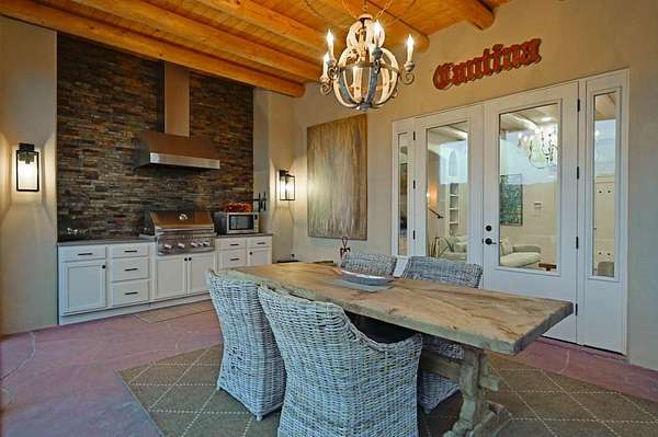 Exceptional mountain views! Beautifully updated Santa Fe home offering classic Southwestern charm and modern amenities. Features include a sun-filled remodeled chef's kitchen with walk-in pantry and an elevator from the oversized 2-car garage for easy access to the secondary refrigerator and multiple storage rooms. The primary suite offers an elegant soaking tub for two and private retreat deck. The two downstairs bedrooms have ensuite bathrooms and an adjoining steam shower, and individual French-door entries that open onto a patio framed by a blooming pollinator's haven. Expansive outdoor living with three distinct portals, the largest fully equipped with a built-in grill and cabinetry for seamless entertaining while enjoying sweeping views of the Sangre de Cristo Mountains, Santa Fe Ski Basin, and Badlands. Located in a private, secure, gated community surrounded by a mature pinon and cedar forest. Approx. 2-acre lot provides peace and serenity, yet you're less than 10 minutes from exceptional culinary spots, the vibrant and historic Santa Fe Plaza, and the world-renowned Santa Fe Opera. Home is in the County and not subject to the Mansion Tax for buyers. Furniture package available.